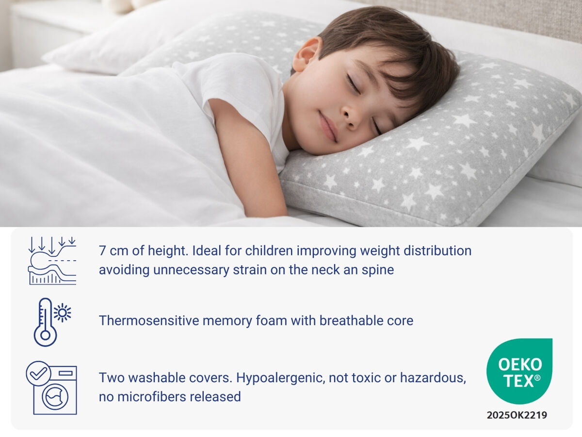 Todos os materiais são certificados OEKO-TEX® Standard 100, assegurando que a almofada é livre de substâncias nocivas e totalmente segura para uso diário por bebês e crianças.