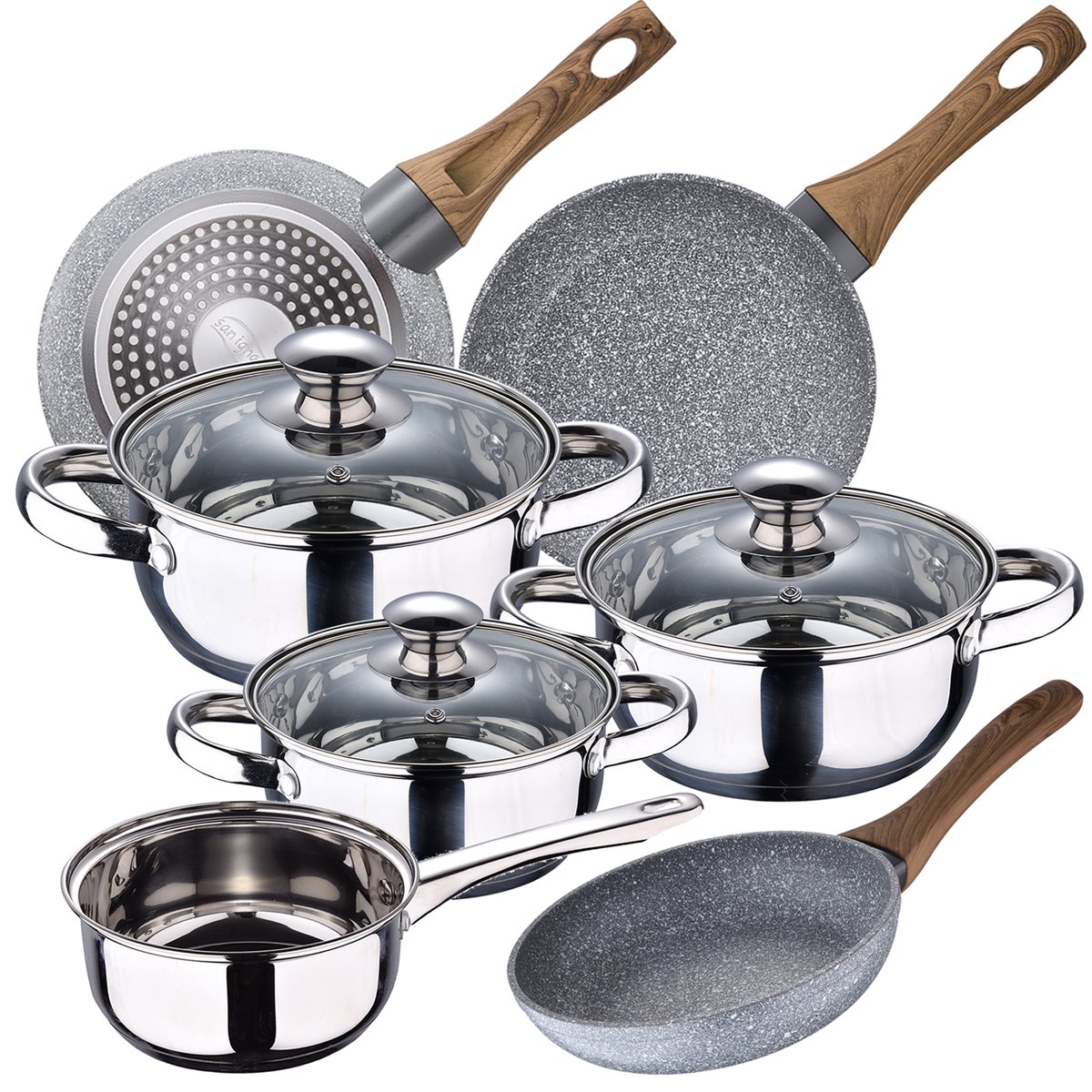 Conjunto de bateria de cozinha composto por 1pc cantou sem tampa Ø16x7.5cm 1.5l / 1pc Caterola com tampa Ø16x7.5cm 1.5l / 1pc canco com tampa Ø18x9.0cm 2.0l / 1pc pastel com tampa Ø20x10cm 3.0l
