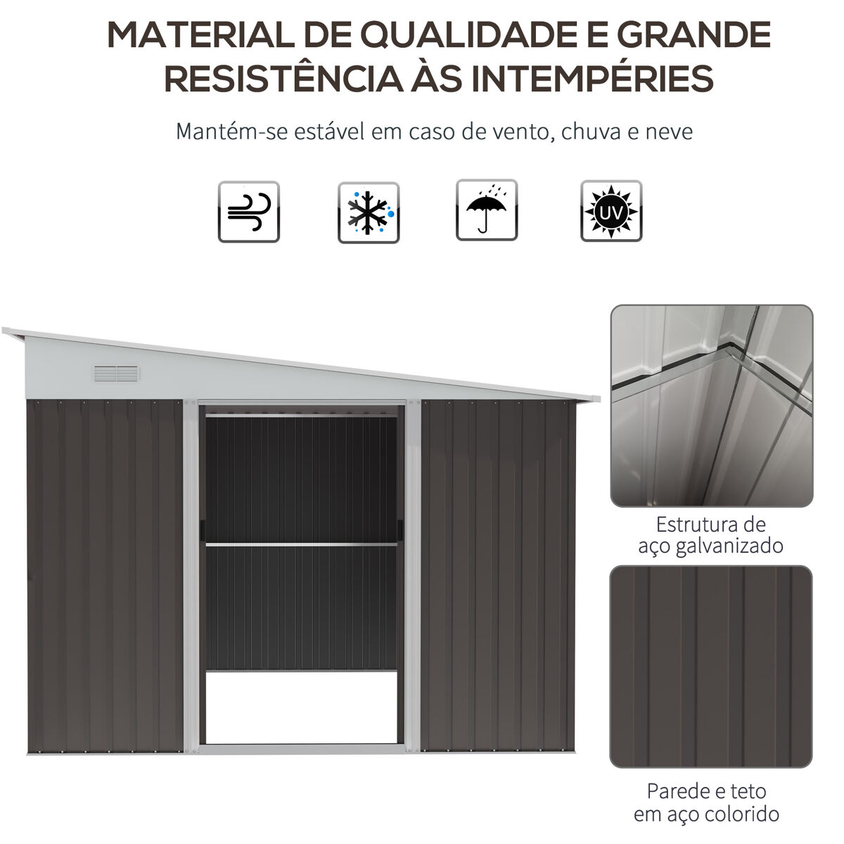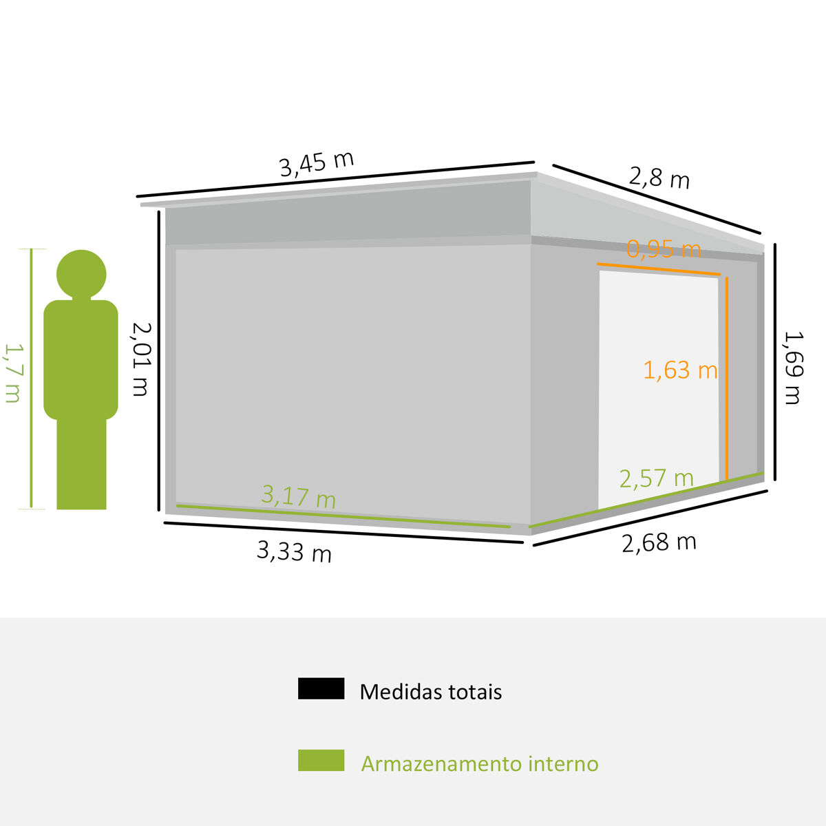 Adicione espaço de armazenamento com este abrigo de exterior da Outsunny. Este abrigo metálico é a solução ideal para ter no seu jardim ou terraço, para guardar ferramentas, utensílios de jardinagem e muito mais. Um abrigo de metal tem vantagens diferentes em relação aos de madeira, não apodrece com a humidade nem com o passar do tempo, é à prova de fogo e quase não requer manutenção. Graças à sua estrutura em aço galvanizado, respiros e porta dupla de correr, você terá um abrigo por anos Características: - Abrigo de jardim com amplo espaço de armazenamento, ideal para guardar bicicletas, ferramentas de jardim, equipamentos para exterior, entre outros - Estrutura de aço ondulado, galvanizado para maior resistência. Forte, durável e resistente à ferrugem e corrosão - Telhado inclinado para evitar acumulação de água - Portas de correr duplas para fácil acesso - Porta com fechadura para maior segurança, com possibilidade de adicionar um cadeado (não incluído) - Duas aberturas de ventilação para manter o interior seco e fresco - Nota: Este abrigo de jardim exterior NÃO inclui piso - Requer montagem Especificaciones: - Cor: cinzento - Material: aço galvanizado - Medidas totais: 280x345x169-201 cm (CxLxA) - Medidas da base: 268x333 cm (exterior), 257x317 cm (interior) - Medidas das portas: 95x163,5 cm (cada uma) - Medidas das aberturas de ventilação: 22,5x9,5 cm (CxL) - Espessura da estrutura galvanizada: 0,6 mm - Espessura da chapa: 0,25 mm (aço colorido) - Referência: 845-529GY O pacote inclui: - ● 1 x Abrigo de jardim; ● 1 x Manual de instruções