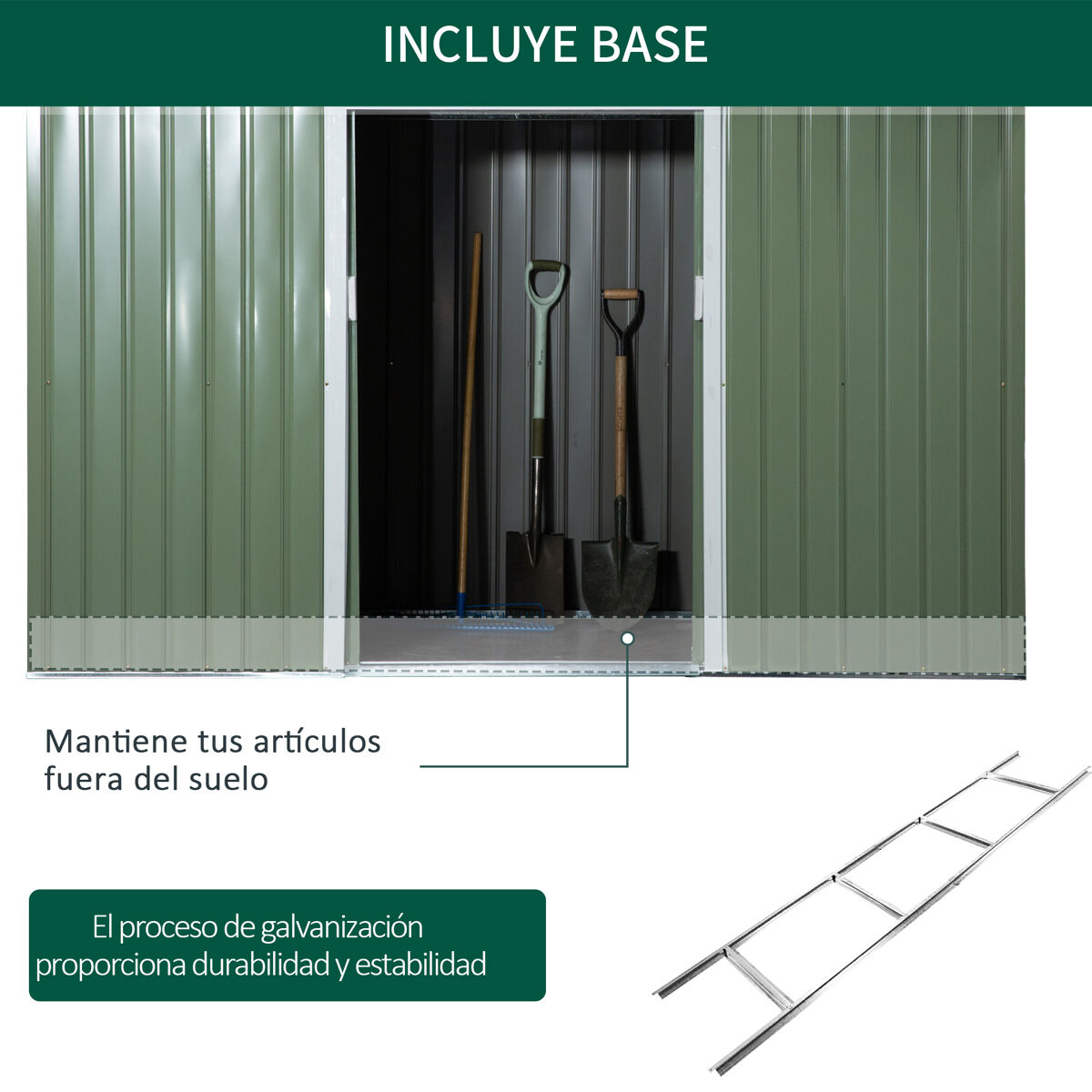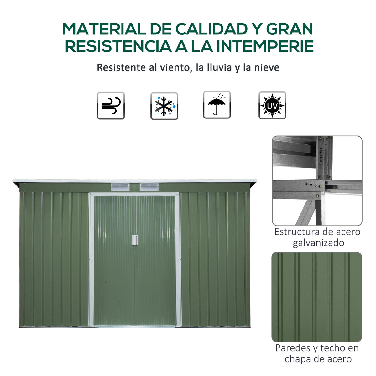 Manter um espaço ao ar livre arrumado e organizado nunca foi tão fácil! E este abrigo de jardim de aço galvanizado da Outsunny é ideal. Conta com um amplo espaço para manter suas ferramentas de jardinagem, bicicletas e pequenos móveis de jardim seguros e arrumados contra intempéries. Seu telhado inclinado favorece o escoamento da água chuva, evitando poças de água que podem causar a formação de ferrugem entre outros danos. Possui 2 aberturas para manter o interior ventilado e uma prática porta deslizante Características: - Amplo espaço interior para guardar materiais e ferramentas de jardinagem, acessórios para a piscina, entre outros - Fabricado em aço galvanizado resistente e ideal para uma utilização prolongada - O telhado inclinado evita o acúmulo de água da chuva - Porta de correr prática de fácil acesso - 2 aberturas para promover o fluxo de ar - Desenho bloqueável para que você possa adicionar um cadeado (não incluído) - A estrutura da base está incluída - Requer montagem Especificaciones: - Cor: Verde claro - Materiais: Aço galvanizado e PP - Medidas totais: 280x130x158-172cm (CxLxA) - Medidas do interior: 266x116cm - Altura do beiral: 168cm - Medidas da porta: 96x152cm - Medidas da abertura de ventilação: 21,8x9,8cm - Referência: 845-032GN O pacote inclui: - ● 1x Abrigo de jardim; ● 1x Manual de instruções