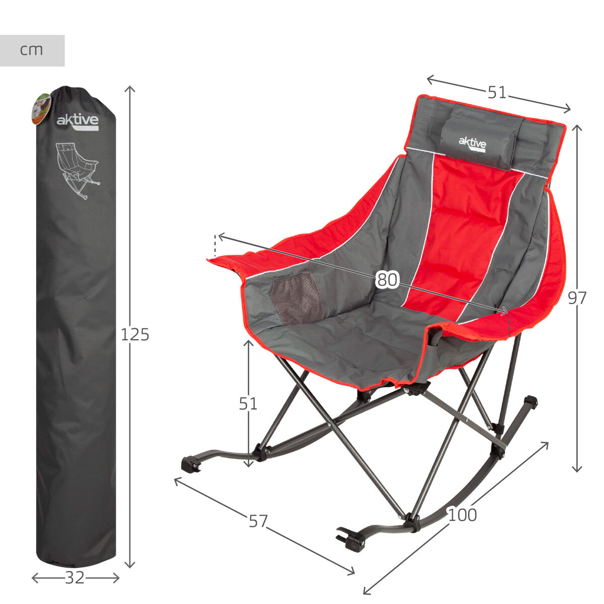 Esta cadeira dobrável é perfeita para descontrair e relaxar ao ar livre, seja no parque de campismo, na praia ou em qualquer outro evento ao ar livre. Foi concebida com uma estrutura de aço robusta e um tecido de poliéster ligeiramente acolchoado (suporta até 110 kg). É uma cadeira de baloiço que oferece o máximo conforto graças ao seu balanço suave, aos apoios de braços confortáveis, ao assento largo e à almofada amovível. Inclui bolsos nas laterais para manter os objectos à mão. A cadeira dobra-se para facilitar a arrumação e é fornecida com um saco de transporte com alça para facilitar o transporte.