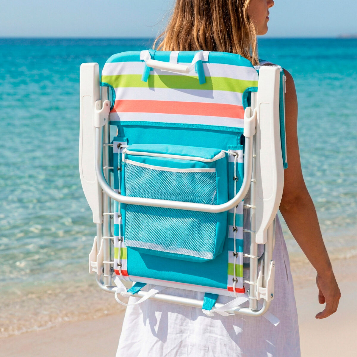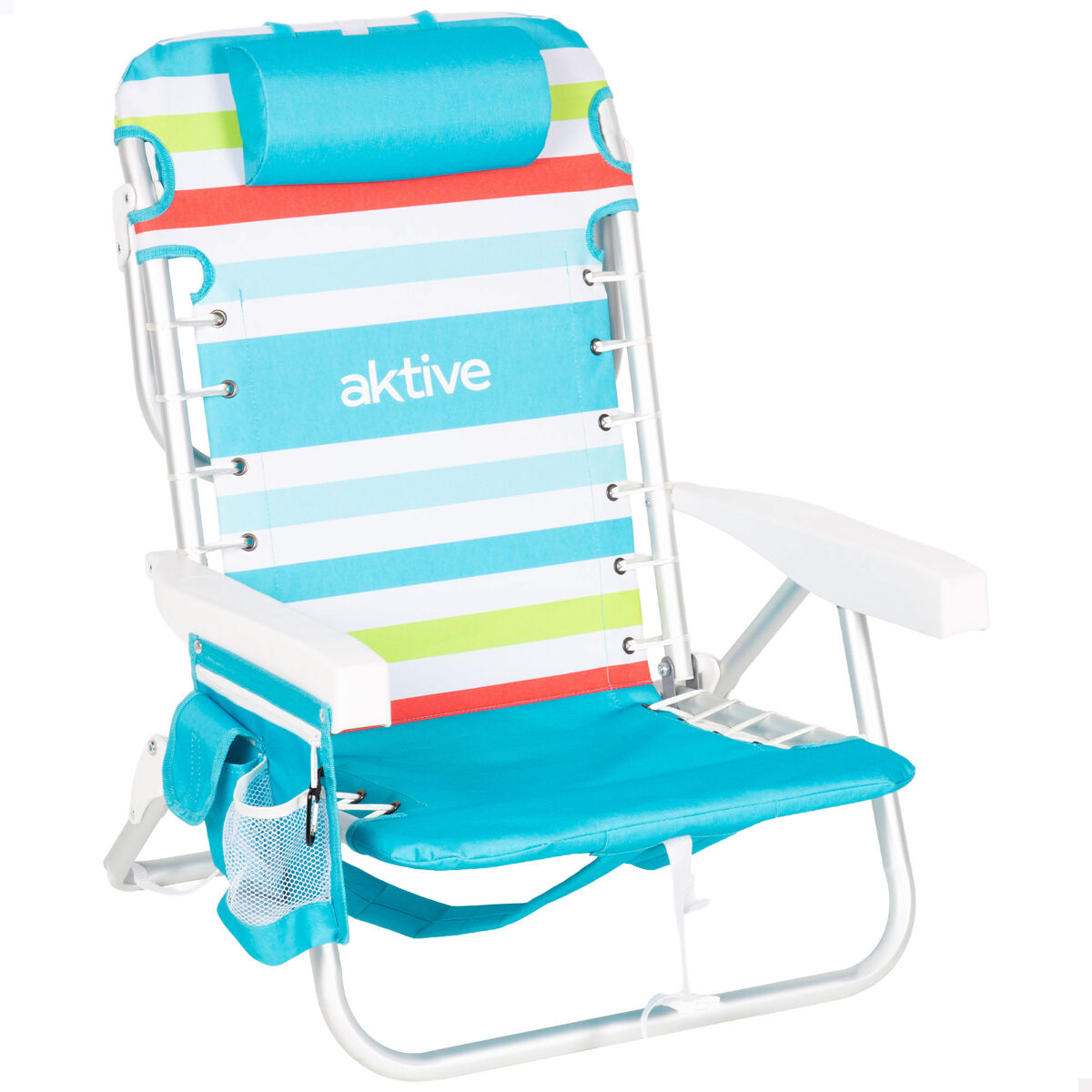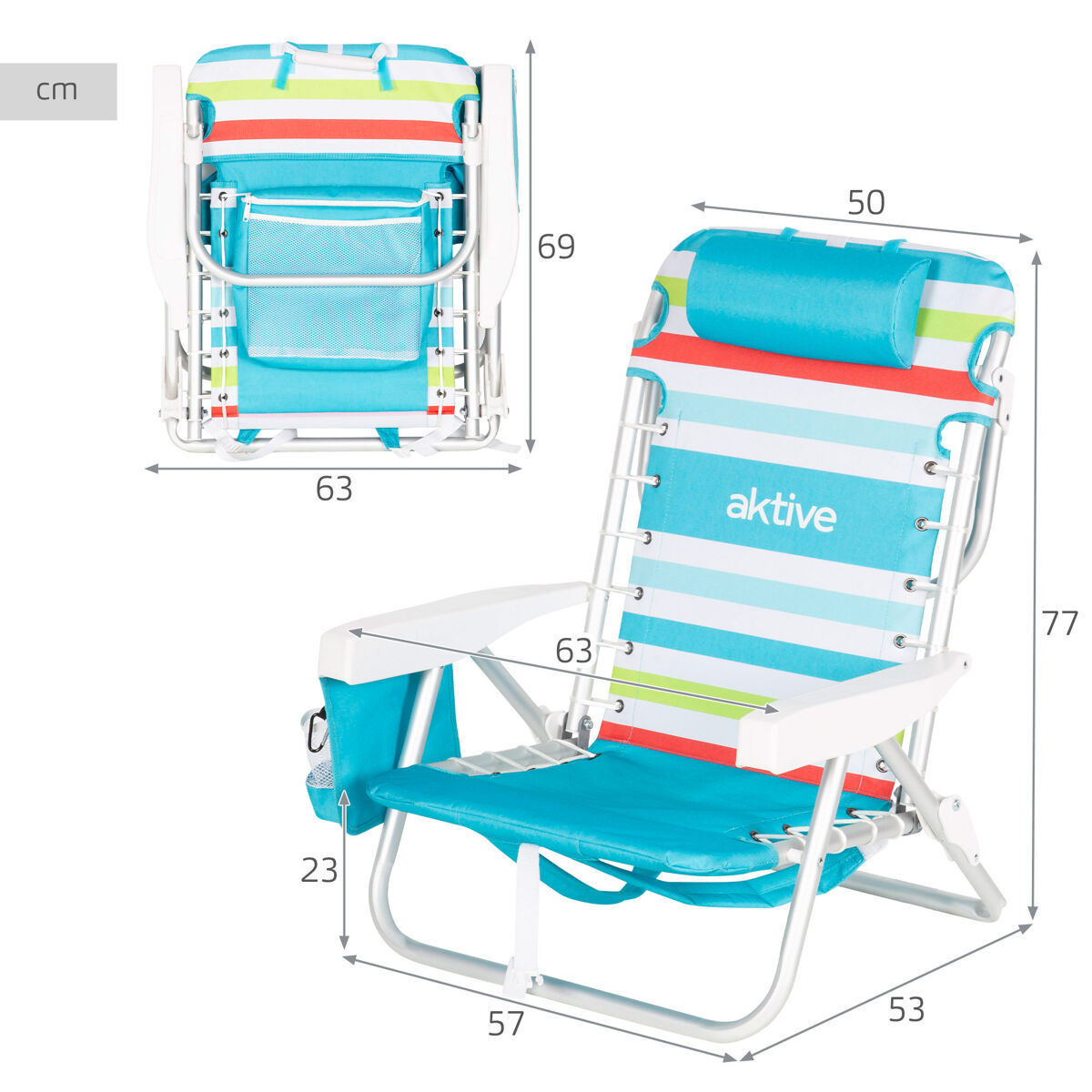 Esta cadeira de praia Aktive combina conforto, funcionalidade e transporte inteligente para aproveitar ao máximo os seus dias na praia, na piscina ou no parque de campismo. A estrutura em alumínio, leve e resistente à corrosão, suporta até 110 kg e garante a sua durabilidade no exterior. O tecido de poliéster respirável com um design às riscas multicoloridas proporciona conforto e frescura durante a utilização, enquanto a almofada almofadada amovível e os apoios de braços ergonómicos melhoram a experiência de descanso. O encosto pode ser reclinado em 5 posições utilizando os apoios para os braços, o que lhe permite ajustar facilmente a inclinação para uma posição de espreguiçadeira baixa, ideal para relaxar ou apanhar sol. O seu assento baixo, situado a 23 cm do chão, favorece uma postura mais confortável e estável na areia. Destaca-se pela sua grande capacidade de arrumação graças ao bolso lateral multifuncional com compartimentos para garrafas, acessórios e pequenos objectos pessoais, bem como um grande bolso traseiro com um compartimento frigorífico isotérmico, perfeito para manter as bebidas ou os alimentos frescos durante mais tempo. Concebida para facilitar o transporte, esta cadeira incorpora um sistema de dobragem compacto com fecho de segurança e alças de mochila que lhe permitem transportá-la confortavelmente às costas, deixando as suas mãos livres. Mede 50x53x77 cm aberta e 63x69 cm dobrada, o que a torna numa opção prática, completa e muito fácil de transportar.