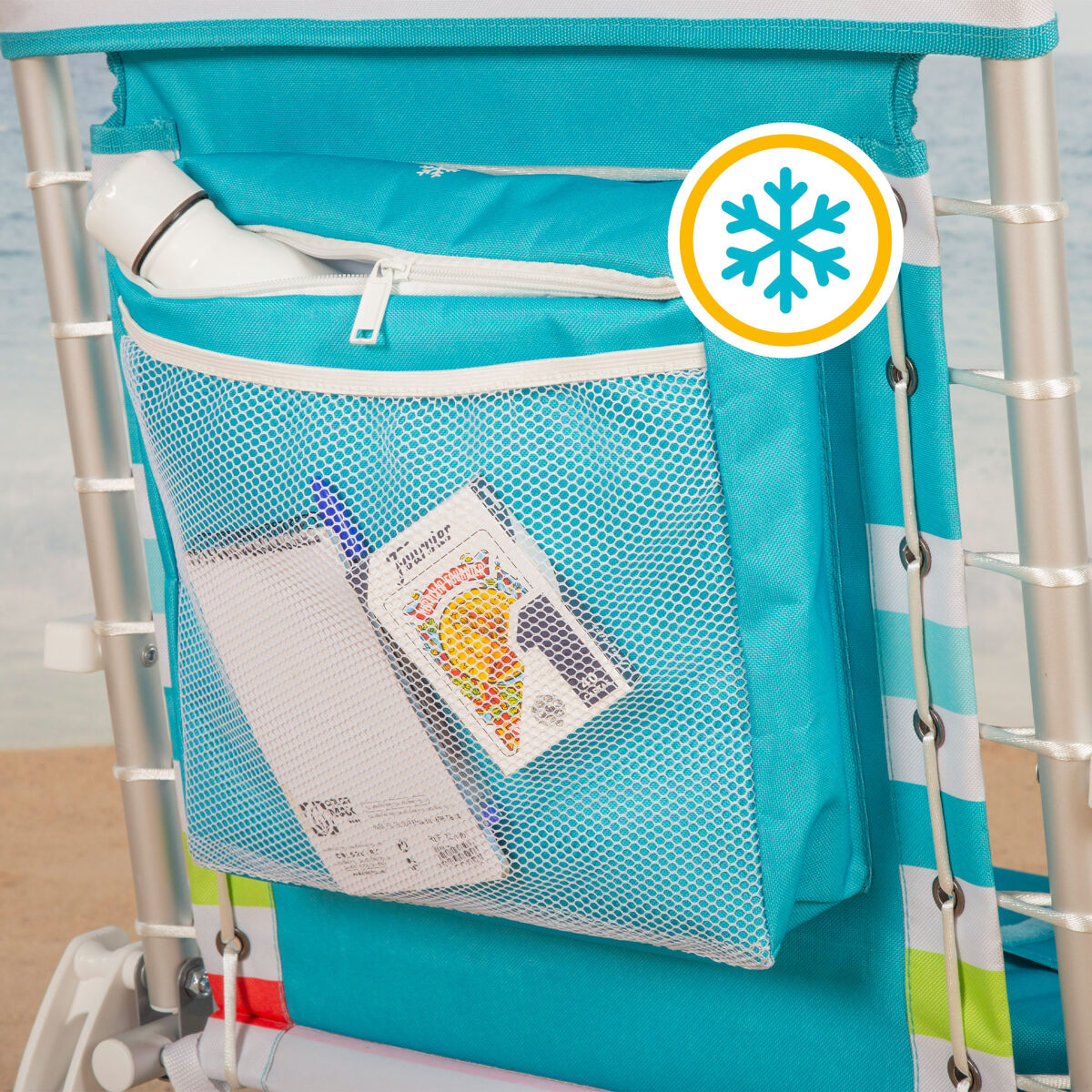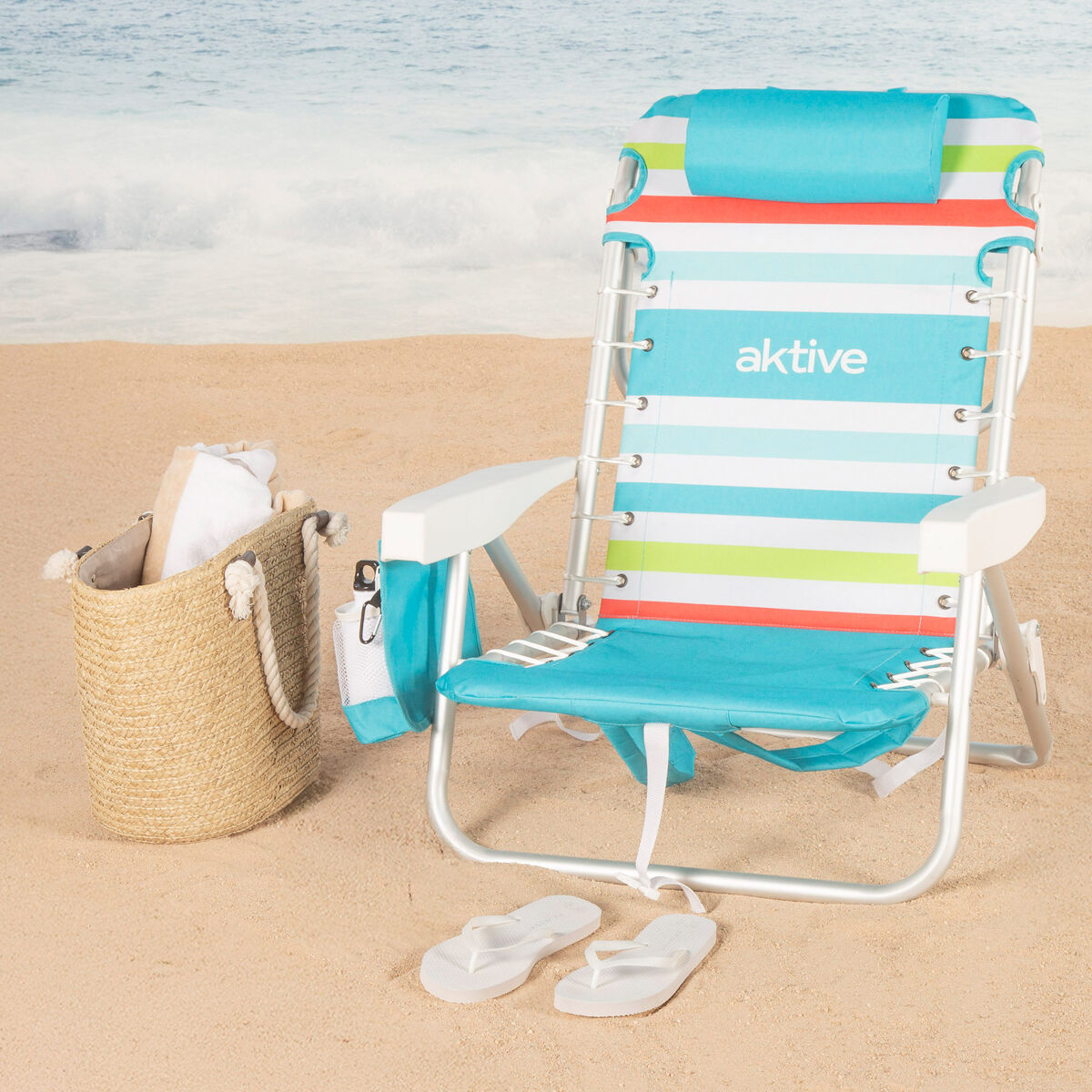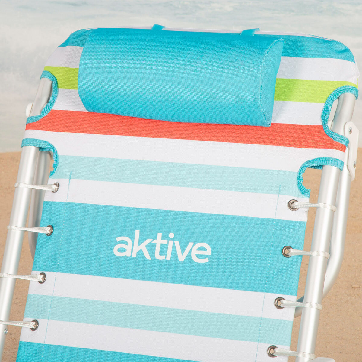 Esta cadeira de praia Aktive combina conforto, funcionalidade e transporte inteligente para aproveitar ao máximo os seus dias na praia, na piscina ou no parque de campismo. A estrutura em alumínio, leve e resistente à corrosão, suporta até 110 kg e garante a sua durabilidade no exterior. O tecido de poliéster respirável com um design às riscas multicoloridas proporciona conforto e frescura durante a utilização, enquanto a almofada almofadada amovível e os apoios de braços ergonómicos melhoram a experiência de descanso. O encosto pode ser reclinado em 5 posições utilizando os apoios para os braços, o que lhe permite ajustar facilmente a inclinação para uma posição de espreguiçadeira baixa, ideal para relaxar ou apanhar sol. O seu assento baixo, situado a 23 cm do chão, favorece uma postura mais confortável e estável na areia. Destaca-se pela sua grande capacidade de arrumação graças ao bolso lateral multifuncional com compartimentos para garrafas, acessórios e pequenos objectos pessoais, bem como um grande bolso traseiro com um compartimento frigorífico isotérmico, perfeito para manter as bebidas ou os alimentos frescos durante mais tempo. Concebida para facilitar o transporte, esta cadeira incorpora um sistema de dobragem compacto com fecho de segurança e alças de mochila que lhe permitem transportá-la confortavelmente às costas, deixando as suas mãos livres. Mede 50x53x77 cm aberta e 63x69 cm dobrada, o que a torna numa opção prática, completa e muito fácil de transportar.