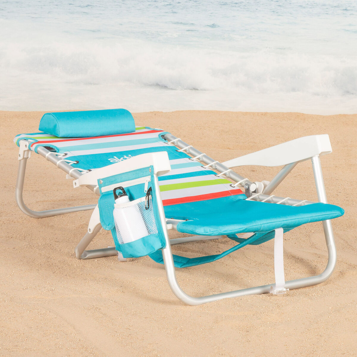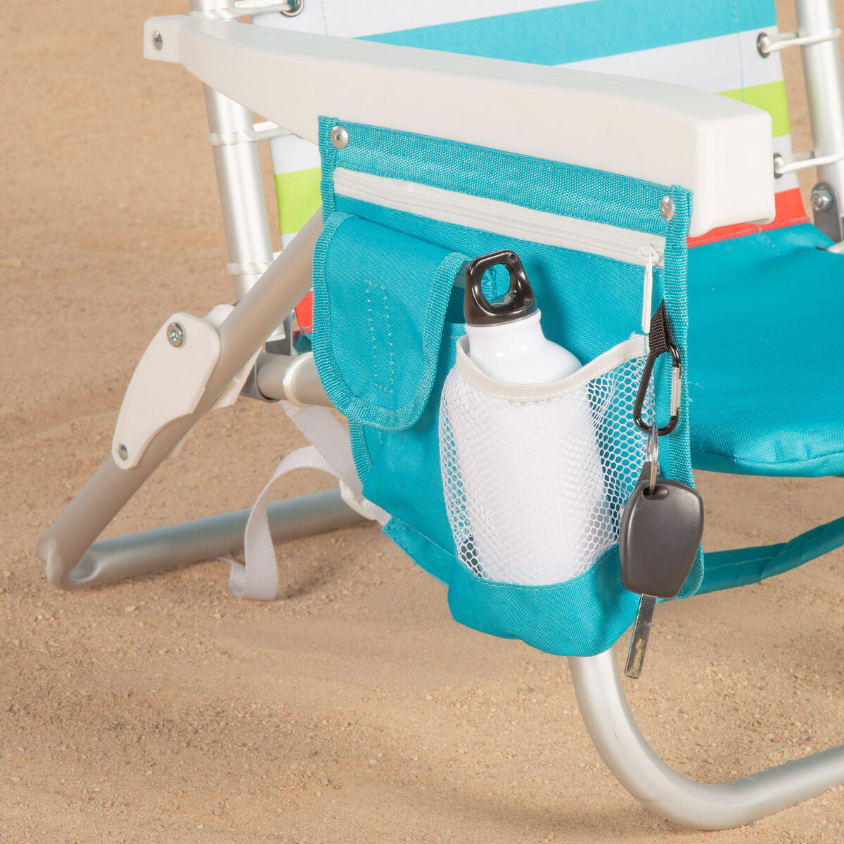 - Encosto multiposições: o encosto reclina-se em 5 posições utilizando os apoios de braços, incluindo uma posição de espreguiçadeira baixa para um descanso mais completo na praia