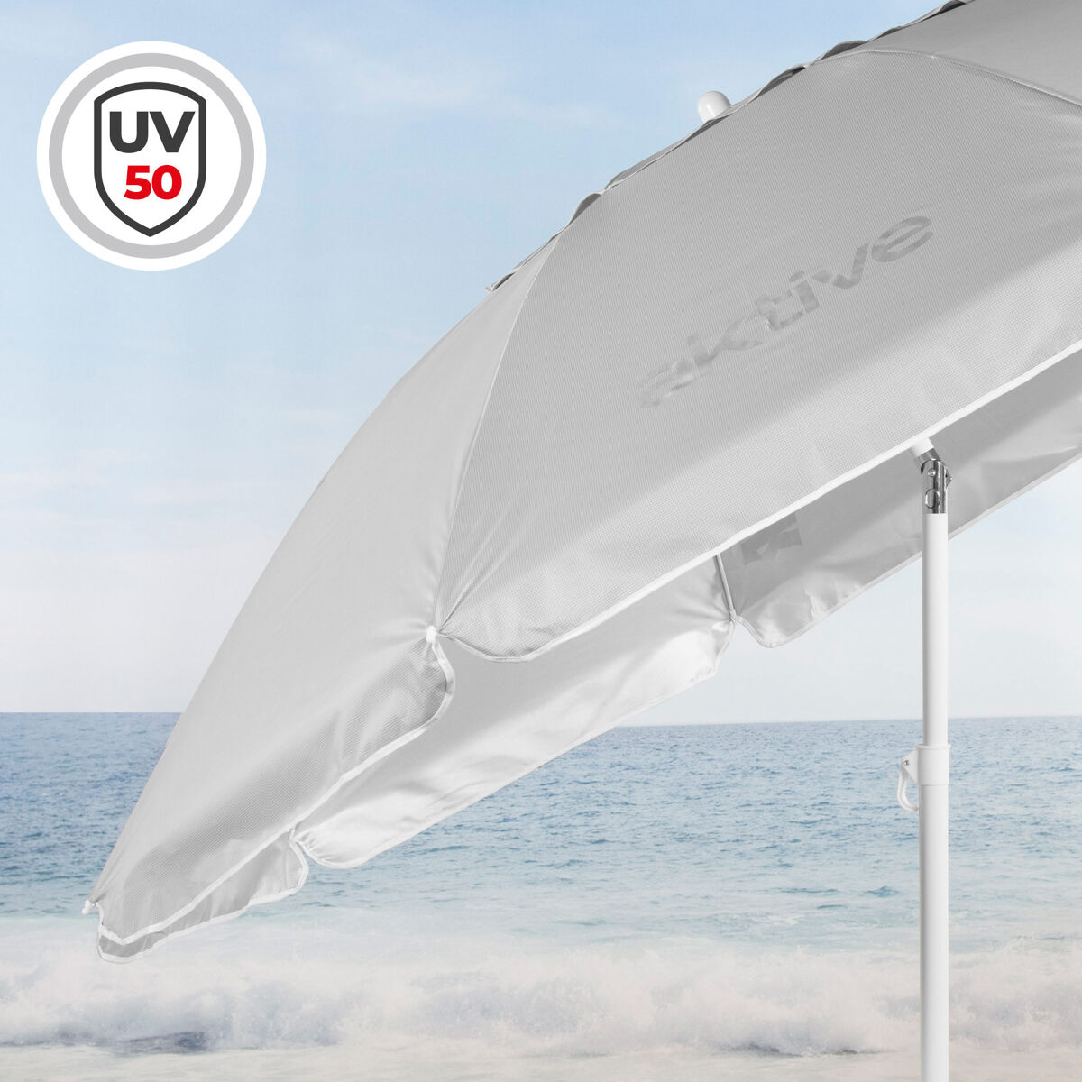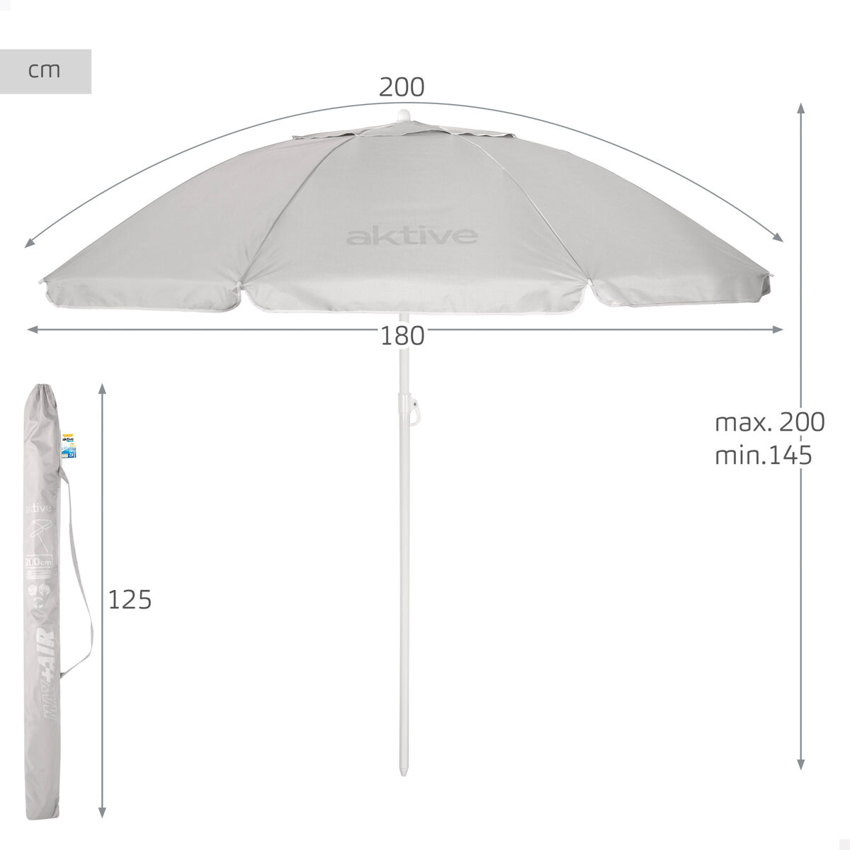 O guarda-sol de praia bege Aktive combina um design elegante com funcionalidades pensadas para o conforto ao ar livre. O seu diâmetro de 200 cm proporciona uma generosa área de sombra para o proteger do sol na praia, piscina ou jardim. Possui um sistema de inclinação e uma altura de mastro ajustável (145-200 cm), permitindo-lhe ajustar o ângulo de acordo com a posição do sol, e ventilação superior MAX+AIR, que promove a circulação de ar e reduz a sensação de calor debaixo do guarda-sol. O tecido Oxford com revestimento prateado e proteção UV50 ajuda a bloquear os raios solares. A sua estrutura, com 8 varetas e um mastro metálico de 28/32 mm, garante estabilidade durante a utilização. Inclui ainda uma bolsa de transporte para facilitar o transporte para qualquer passeio de verão.