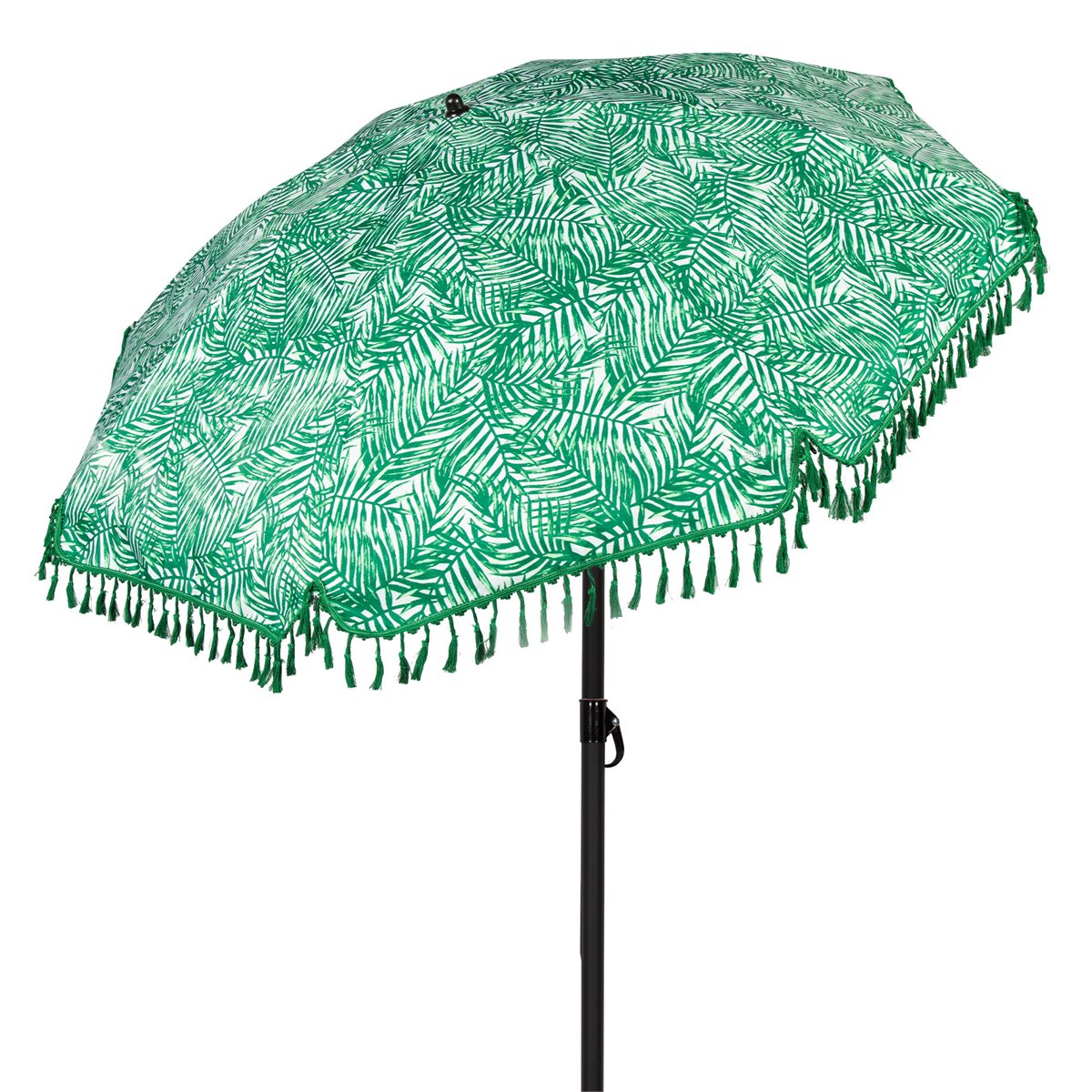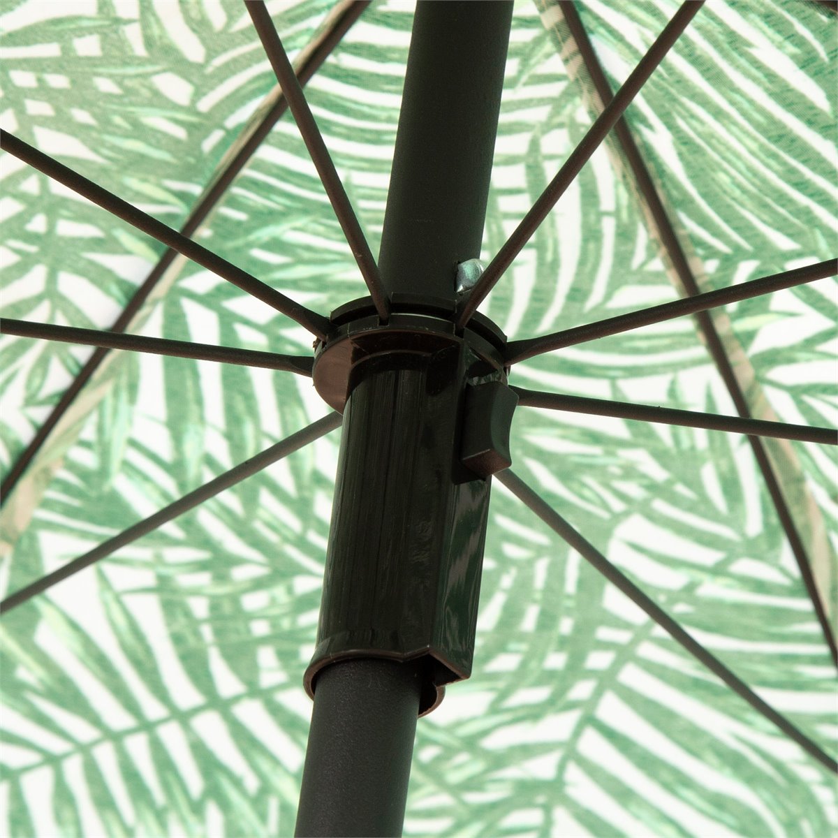 Aproveite o verão com o guarda-sol de praia de 180 cm, projetado com estampa de samambaia tropical e franjas decorativas elegantes para um estilo único e sofisticado. Seu mastro de aço de 22/25 mm oferece grande resistência e estabilidade, além de contar com sistema de inclinação ajustável para regular a sombra em função do sol. Feito em poliéster com proteção UV30, protege dos raios solares e prolonga sua durabilidade. Com estrutura de 8 nervuras, garante maior firmeza e resistência ao vento. Inclui também um saco de transporte correspondente, ideal para levá-lo confortavelmente para a praia ou para qualquer escapadela.