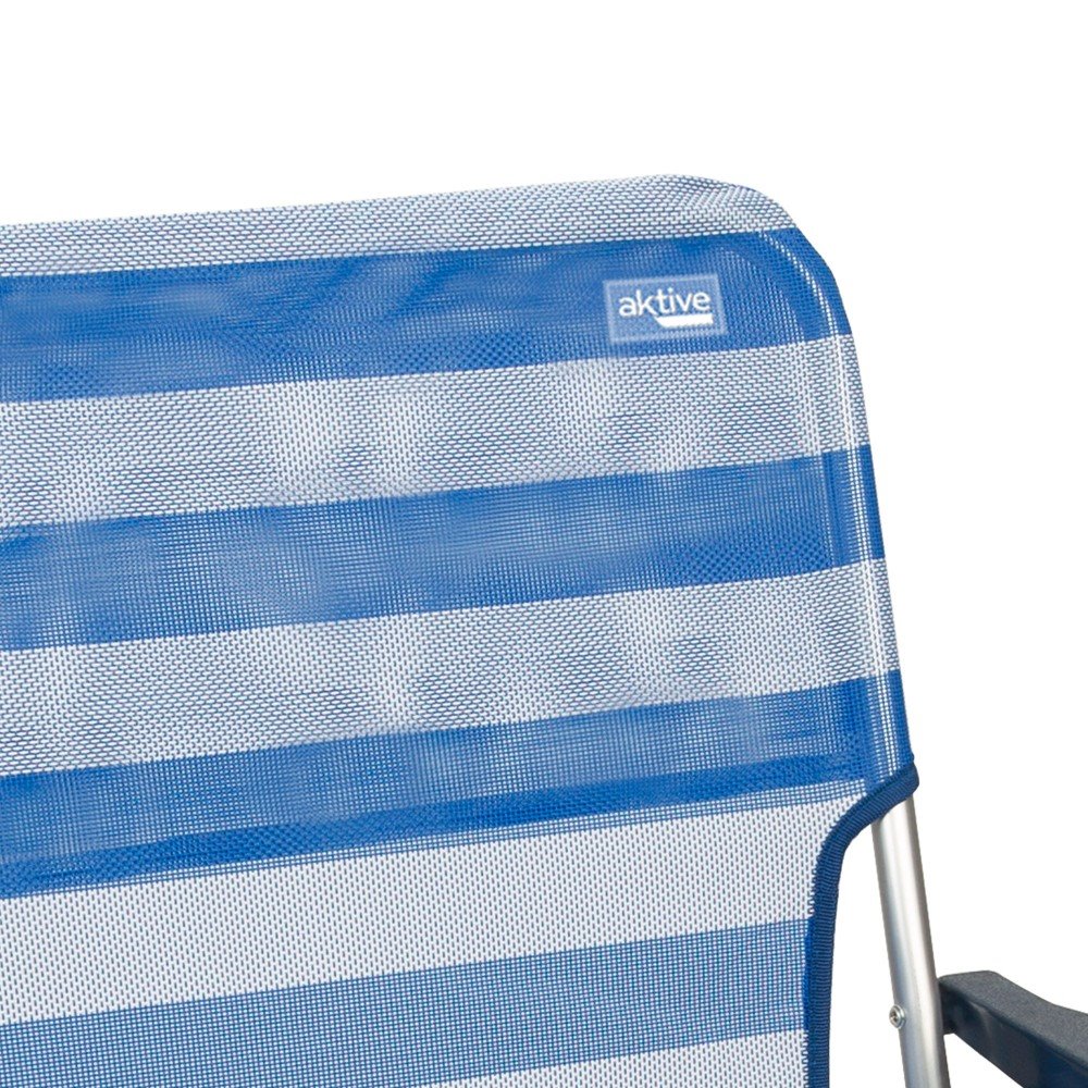 Pack composto por duas cadeiras de praia dobráveis Aktive com estrutura em alumínio (suporta até 100 kg), tecido textilene e apoios de braços em plástico resistente. São cadeiras com encosto fixo e assento baixo, que incorporam antiderrapantes nas pernas para maior estabilidade, mesmo em terrenos irregulares ou superfícies arenosas. São muito fáceis de transportar graças ao seu tamanho prático e manejável, à estrutura dobrável e à pega de ombro integrada.