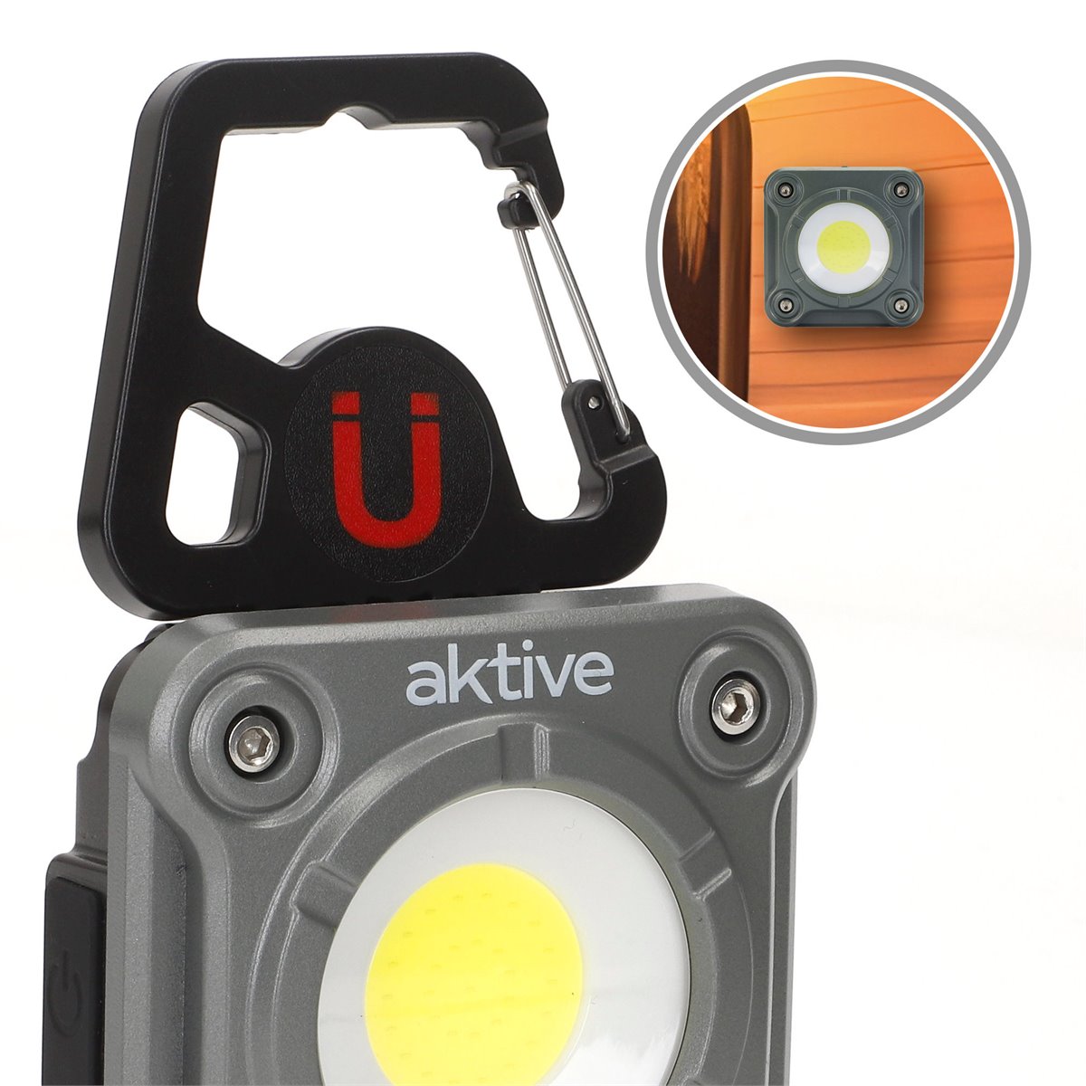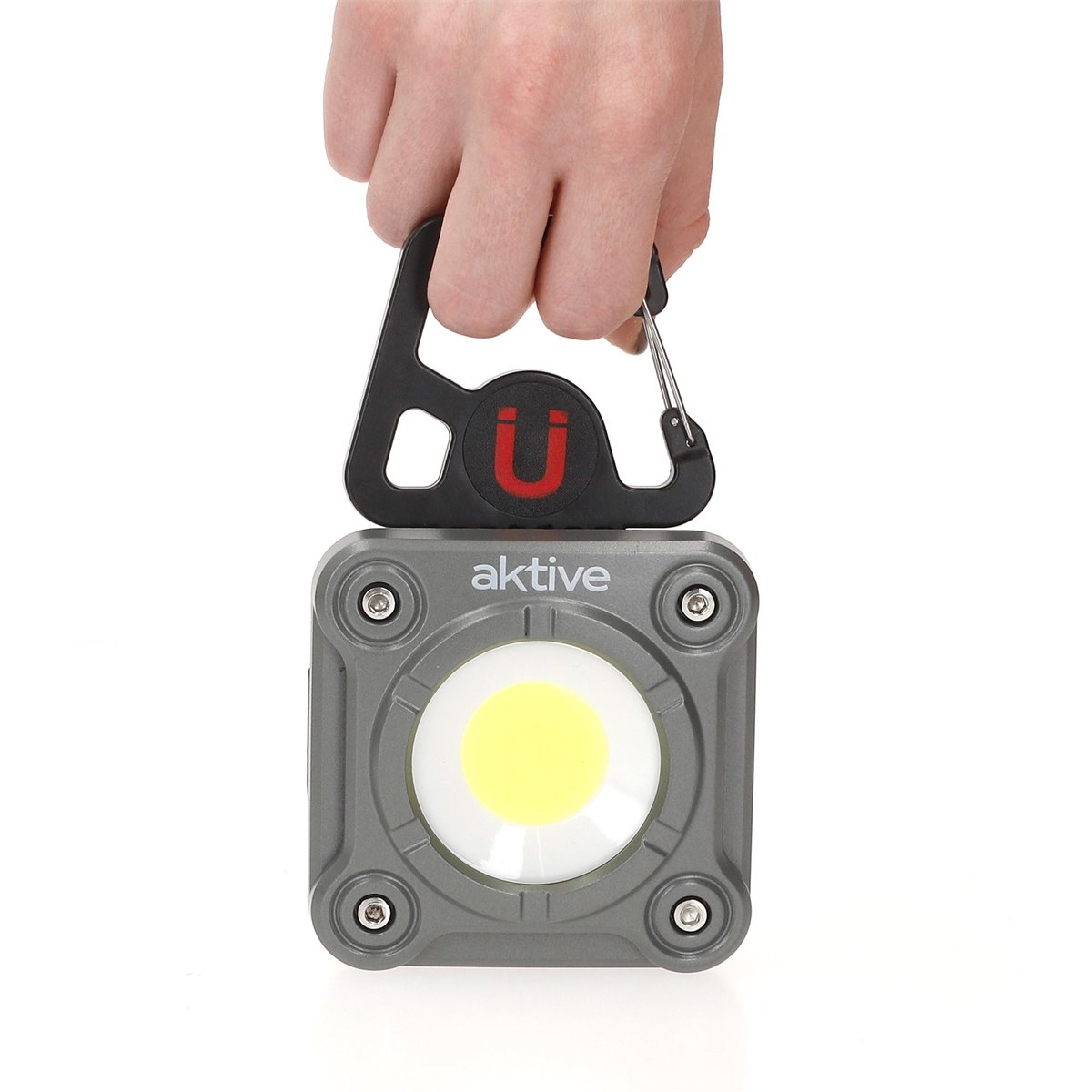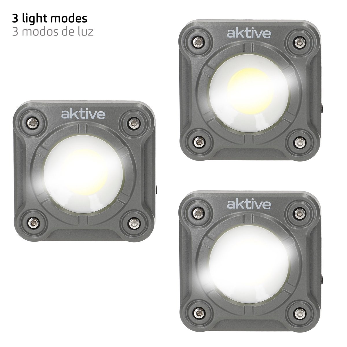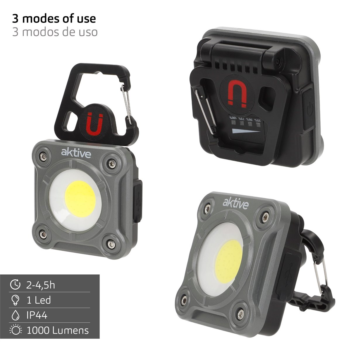 Aktive Refletor LED multiusos ideal para iluminar o jardim, pátio ou qualquer área externa. Está equipado com 1 LED que gera uma luz branca com intensidade de 1000 lumens, proporcionando uma iluminação brilhante e eficiente até 30 metros. A luz LED ajusta-se em 3 posições para iluminar em diferentes direções e, além disso, o refletor incorpora um pequeno orifício na base para montá-lo em tripés ou outros suportes e um ímã para aderir às superfícies metálicas. Com bateria que dura de 2 a 4,5 horas após carga completa, é perfeito para uso noturno e em situações de pouca luz. Sua construção à prova d'água IP44 o torna adequado para uso em condições climáticas adversas. O holofote carrega via USB (incluído) e é fácil de transportar graças à sua alça manual e ao tamanho pequeno, leve e compacto.