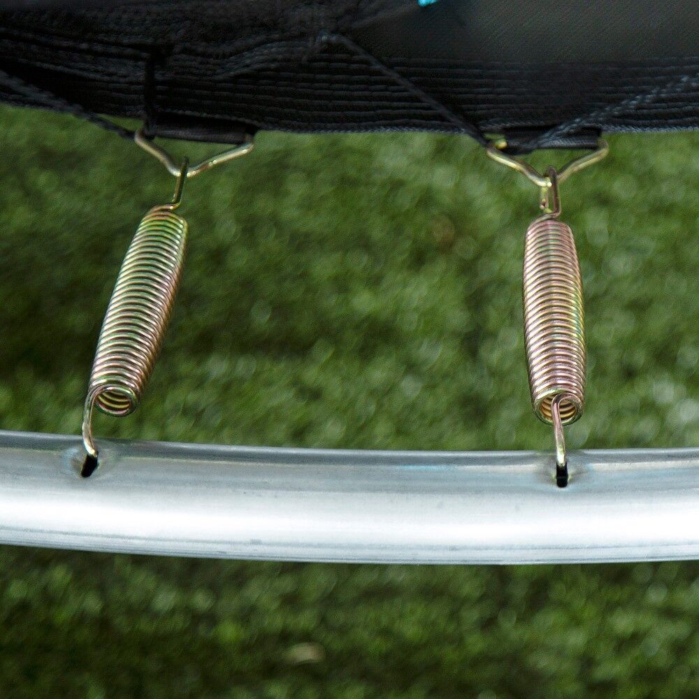- Máxima segurança: equipado com área de salto com molas galvanizadas para maior amortecimento, borda protetora acolchoada que cobre as molas e rede de segurança, com zíper e fivelas, apoiada em postes acolchoados que protegem contra impactos