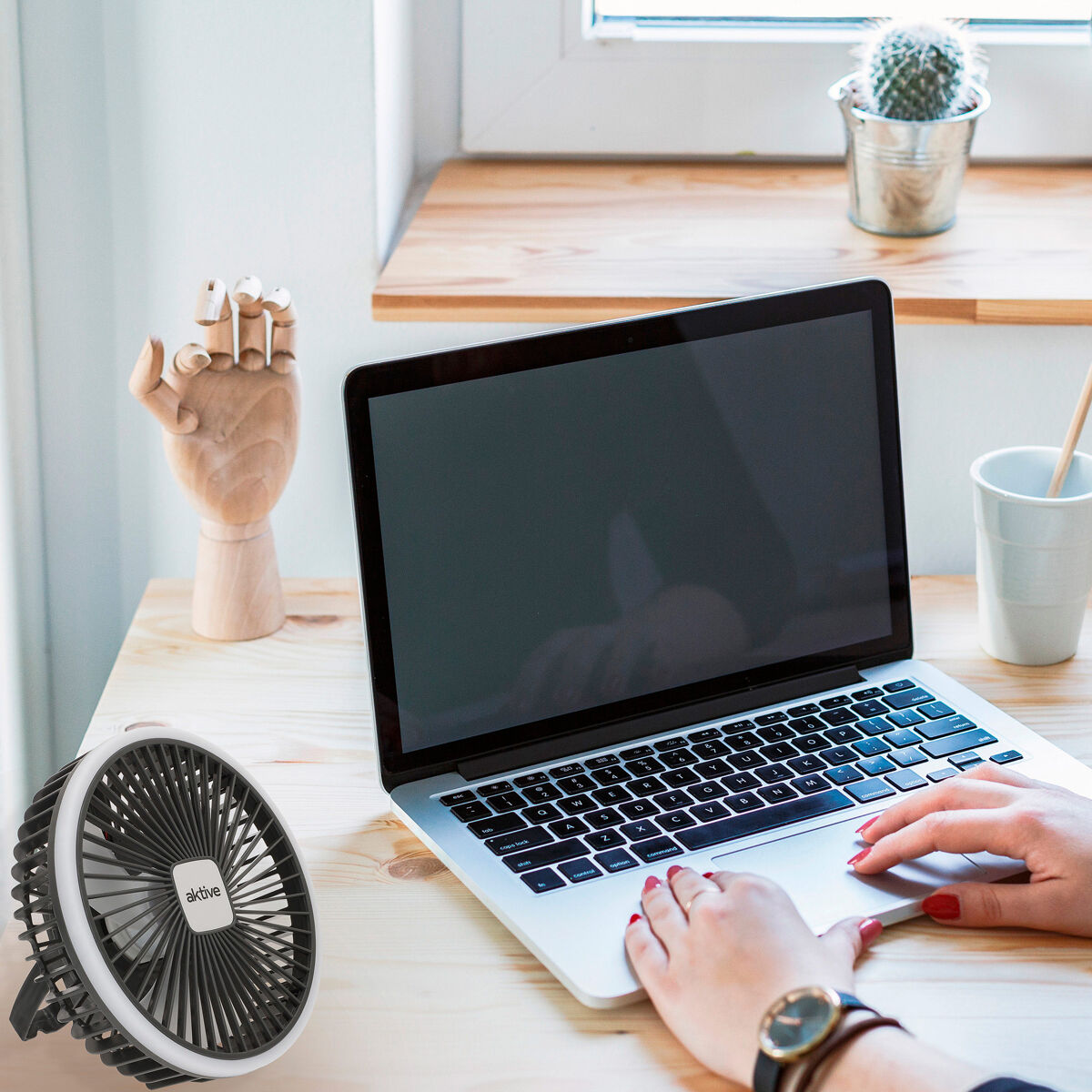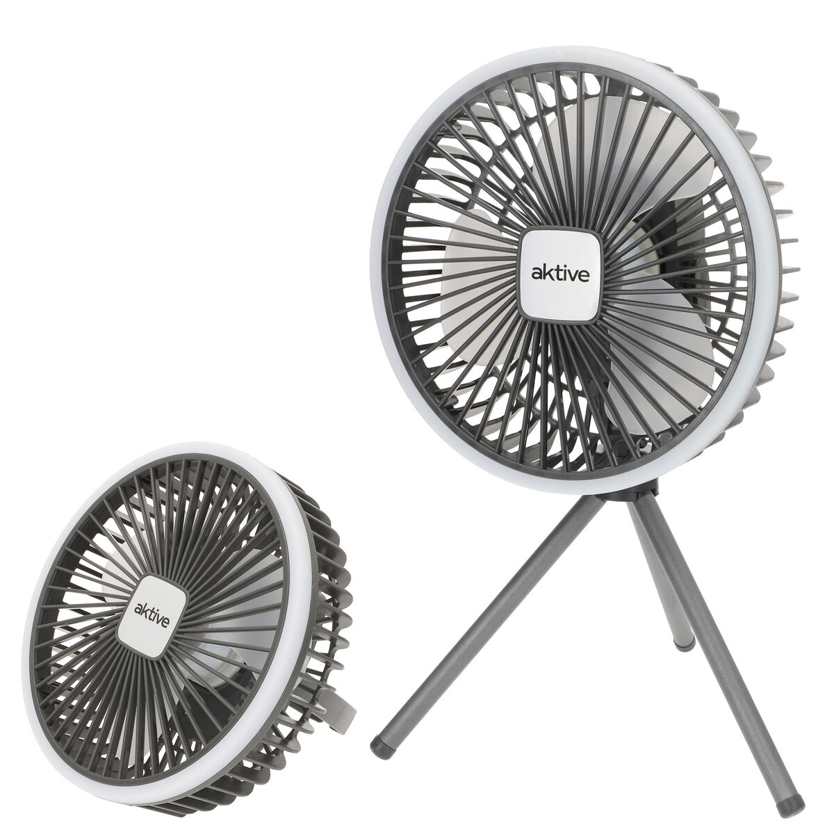Descubra a pequena e silenciosa ventoinha portátil 3 em 1 Aktive, ideal para casa, escritório ou qualquer atividade ao ar livre. Possui um suporte dobrável na parte de trás, que permite colocá-la de forma estável em superfícies planas ou pendurá-la numa variedade de locais, como no teto ou na parede. Além disso, está incluído um tripé amovível para uma colocação mais elevada e estável em diferentes superfícies. A ventoinha eléctrica é muito silenciosa e oferece três níveis de velocidade: baixa para um fluxo suave, média para uma ventilação moderada e alta para um arrefecimento potente e rápido. Incorpora uma luz branca de 24 lúmenes e tem um alcance de 3 a 5 metros, ideal para iluminar espaços pequenos e médios. A sua bateria proporciona 1,5 a 5 horas de funcionamento contínuo e é facilmente recarregada através de USB (cabo incluído).