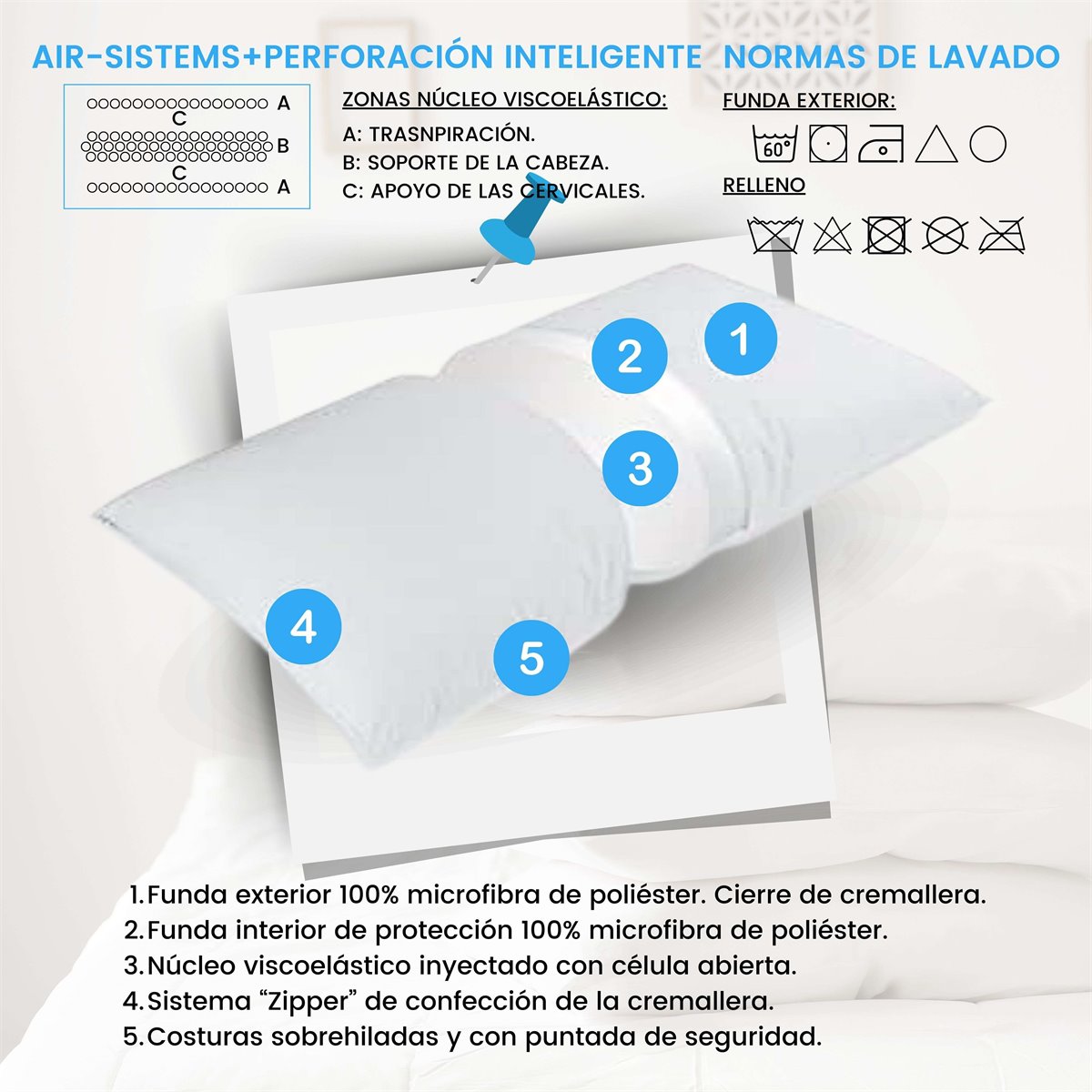 Oferecemos-lhe uma almofada do fabricante Moshy composta por: Duas capas, uma exterior em microfibra 100% poliéster e uma interior também em microfibra 100% poliéster, com enchimento em poliuretano viscoelástico 100% de baixa densidade, Entre as suas características destacam-se a incorporação da tecnologia Air-Systems (sistema de respirabilidade), proporcionando à almofada uma perfeita circulação de ar devido aos três canais de ventilação que a perfuram, Possui ainda um núcleo viscoelástico com efeito memória e perfuração multizona inteligente e termossensível, para que se possam ver três zonas com densidades diferentes para facilitar a correta adaptação da nossa zona cervical, Ergonomia: - Altura: Média - Maciez: Toque sedoso - Firmeza: Muito suave - Peso: Médio - Recuperação: Efeito memória - Adaptação: Máxima - Manutenção: Não lavável - Respirabilidade: Muito alta