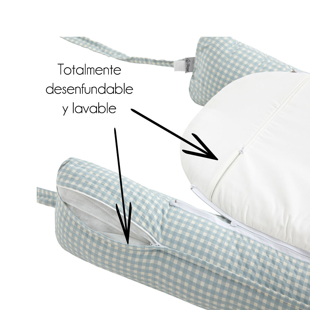 Base impermeável e lavável. As fugas do seu bebé enquanto dorme ou muda de fralda não serão um problema, uma vez que a base da almofada é feita de um material totalmente impermeável. Assim, evita-se que o líquido escorra pela almofada e manche a superfície em que está assente (cama, mesa, etc.). A base é muito fácil de limpar, tanto à mão como à máquina. A almofada redutora é totalmente amovível (tanto a base como a redutora), pelo que pode lavá-la rápida e facilmente quando precisar. Basta abrir os fechos de correr da base e do rebordo e retirar o enchimento para lavar as capas. O tecido 100% algodão com elastano pode ser lavado a altas temperaturas.