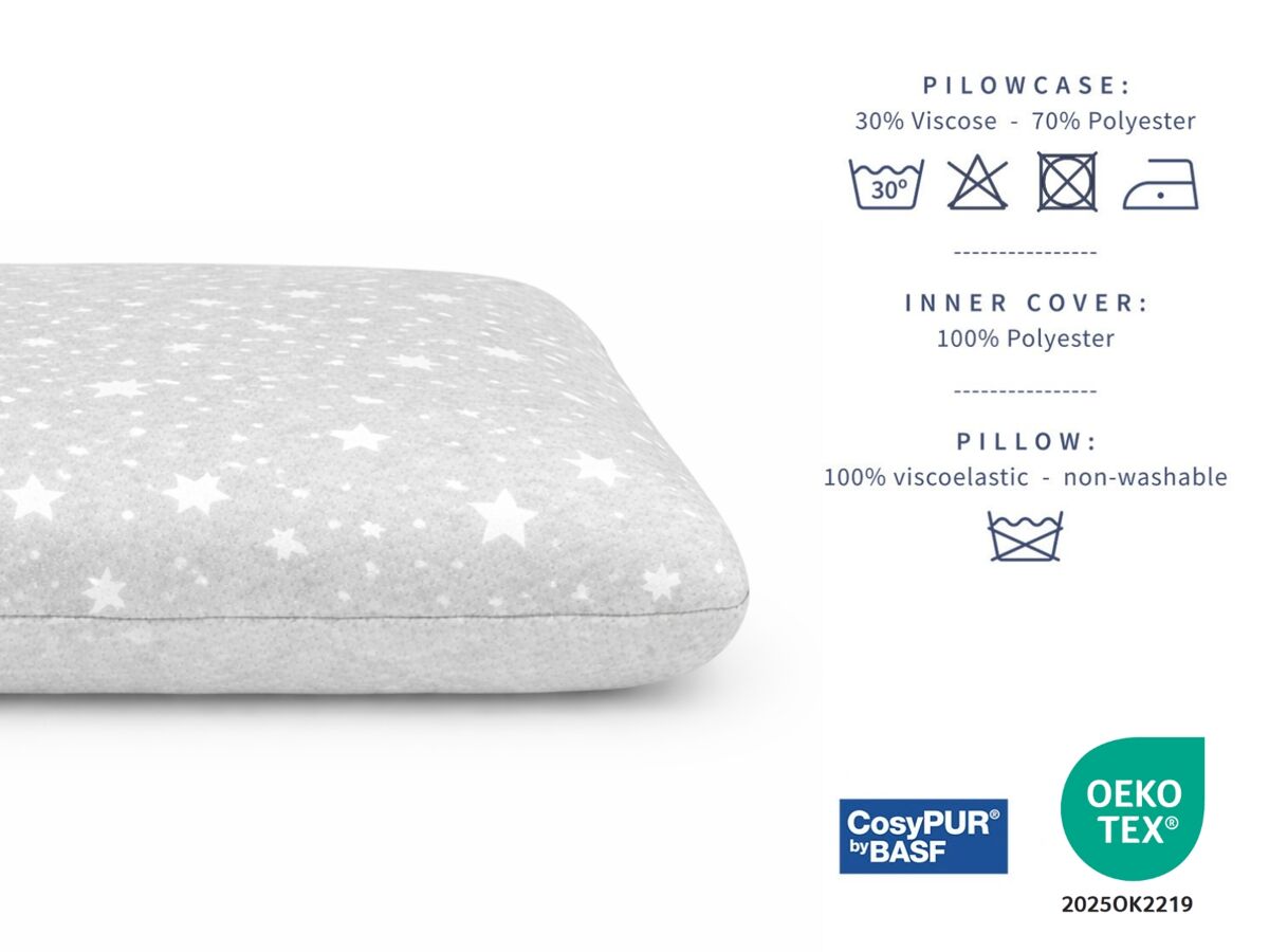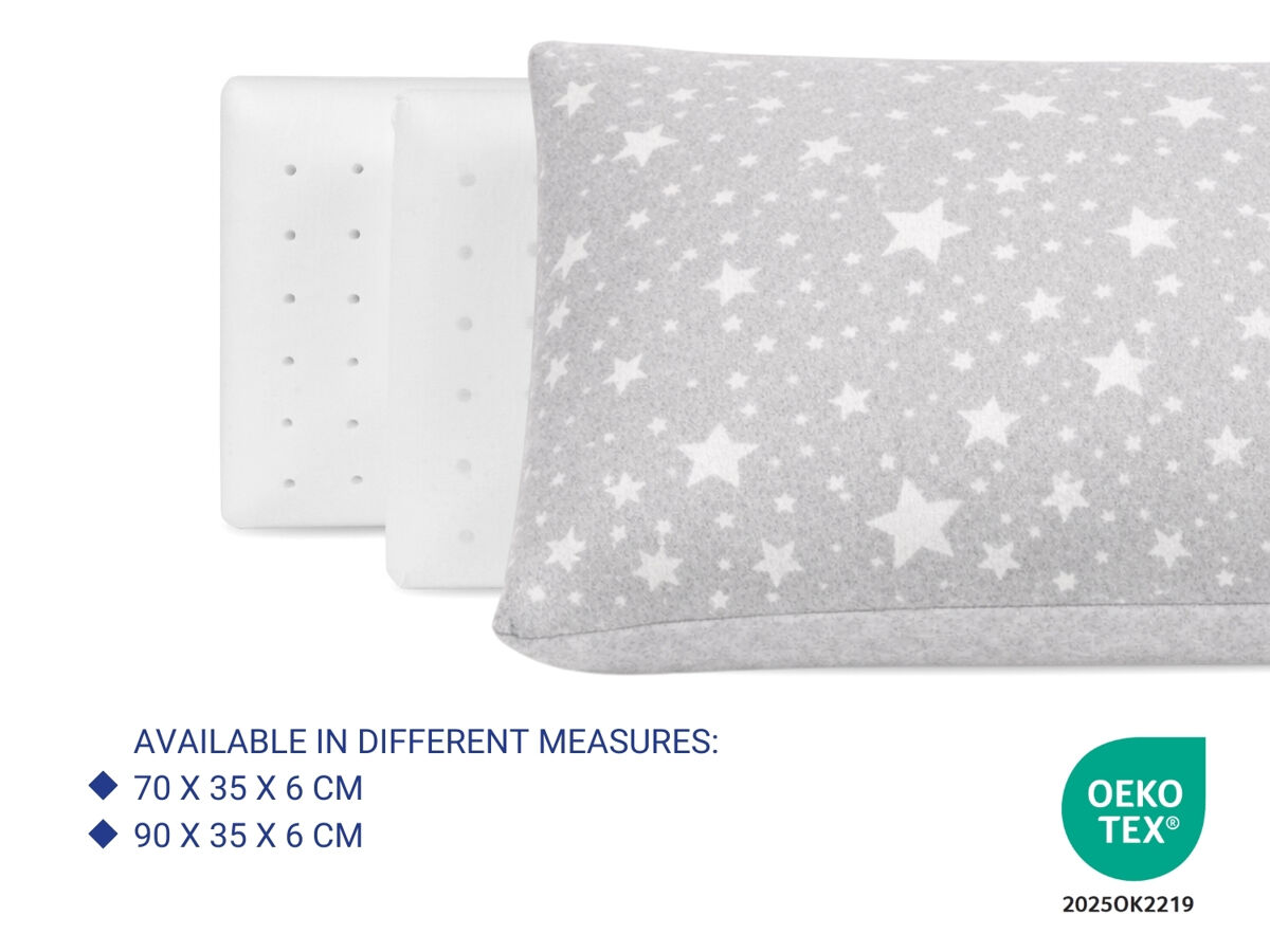 Todos os materiais são certificados OEKO-TEX® Standard 100, assegurando que a almofada é livre de substâncias nocivas e totalmente segura para uso diário por bebês e crianças.