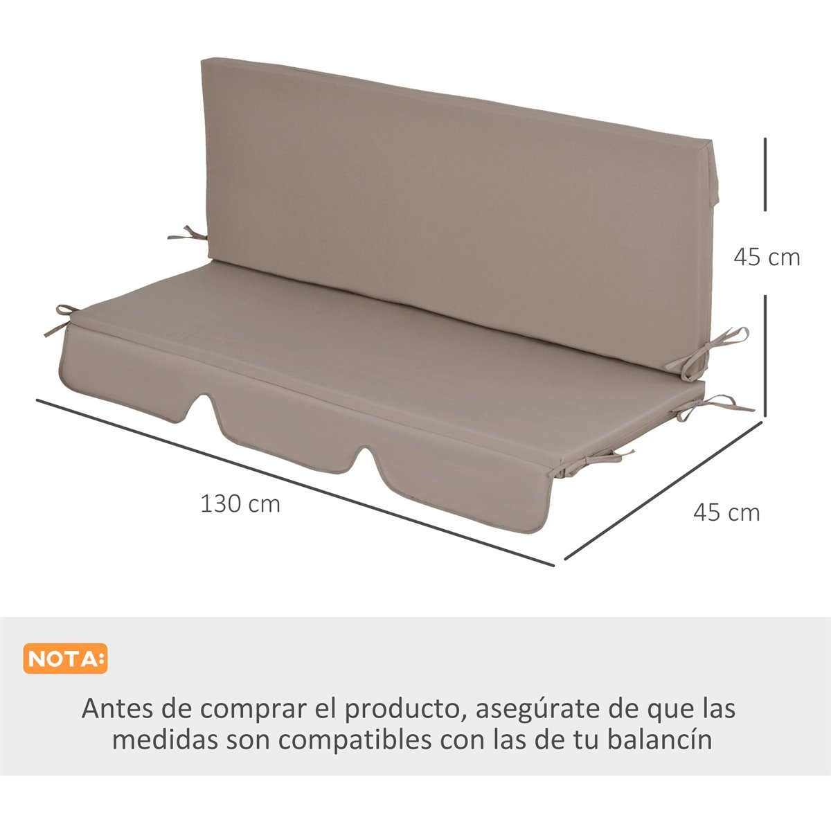 Você tem um baloiço em seu jardim de 3lugares e quer adicionar uma confortável almofada? Esta prática almofada de Outsunny é uma ótima solução. Seu estofamento de espuma alta densidade, juntamente com cor neutra e tecido de poliéster suave, garantem a firmeza e resistência necessárias para proporcionar um descanso excepcional. A almofada está equipadas com cordões, para poder amarrar ao banco, evitando que se deslize ao sentar. É perfeita para desfrutar de um assento confortável enquanto lê o seu livro favorito Características: - Elegante e confortável almofada para baloiços de 3 lugares - Composto por 2 peças, uma para o encosto e outra para o assento - Almofada estofada em um agradável tecido de poliéster suave e macio - O estofamento de alta densidade oferece grande conforto - Conta com cordas para poder amarrar ao banco, evitando assim que se deslize ao sentar - A almofada não é lavável, basta limpá-la com um pano húmido - Ideal para baloiços de interior e exterior - Quando não estiver a ser utilizada guarde - Compatível com baloiços com a referência: 84A-054 Especificaciones: - Cor: Marrom - Materiais: Poliéster e espuma - Medidas de ambas almofadas: 130x45x5 cm - Medidas de assento adequado: 130x45 cm● Referência: 84G-166V00BN - Notas: A almofada do banco não é lavável, basta limpar com um pano húmido. Referência do baloiço compatível: 84A-054 O pacote inclui: - ● 1x Almofada de encosto; ● 1x Almofada de assento;