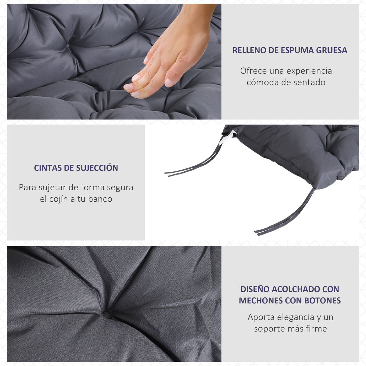 O assento do seu banco ou baloiço magoa o corpo quando se senta? Tem uma almofada muito antiga que já não é tão confortável como antes? Com esta almofada para banco da Outsunny, não terá mais que se preocupar e poderá desfrutar dos seus momentos de relaxamento ao ar livre com o máximo conforto. Não espere até que o seu corpo se ressinta por adotar uma má postura ao sentar-se mal. Esta almofada de exterior com design capitonê é a combinação perfeita de conforto e elegância para o seu banco! Características: - A largura de 100 cm permite que dois adultos se sentem confortavelmente ou que uma família de três pessoas se sente junta - Almofada elegante e confortável para bancos de 2 lugares ou baloiços - Composta por 2 secções diferenciadas, para o assento e o encosto - Almofada para exterior revestida com um tecido de poliéster respirável e agradável ao toque - O design capitonê acolchoado com botões proporciona maior densidade ao enchimento e um aspeto muito elegante - Almofada para banco de jardim com 6 tiras de fixação para evitar que voe com o vento ou deslize ao sentar-se - Tenha em conta que esta almofada não é removível nem lavável à máquina. Especificaciones: - Cor: cinzento escuro - Material: algodão PP e tecido 100% poliéster de 200 g/m² - Medidas totais: 100x98x8 cm (CxLxA) - Profundidade do assento: 49 cm - Altura do encosto: 49 cm - Referência: 84B-137 O pacote inclui: - ● 1 x Almofada para banco de exterior