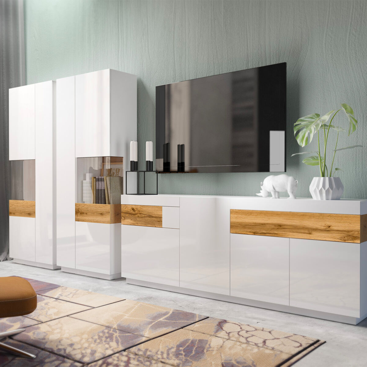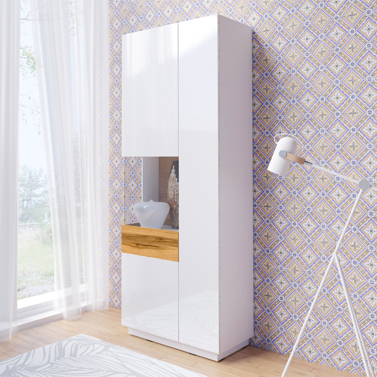 Andrea Armário expositor de 2 portas, branco e madeira, abertura à esquerda