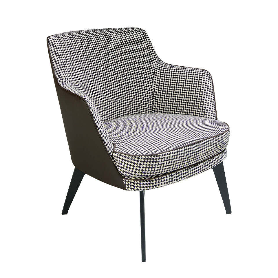 Poltrona com braços de design moderno com assento estofado em tecido preto e branco e encosto estofado em couro sintético castanho chocolate. Tanto pelo seu estilo como pelas suas pernas em aço inoxidável preto, este Poltrona é a combinação perfeita entre design e conforto.
