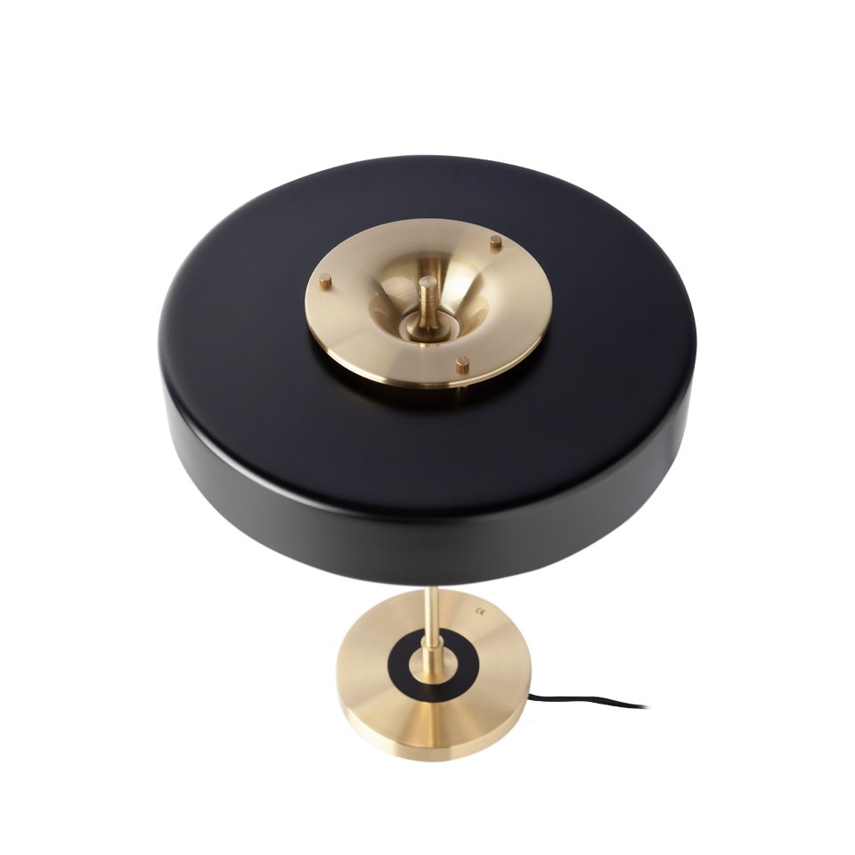 Candeeiro de mesa em alumínio dourado. Abajur em alumínio com acabamento preto mate e proteção de vidro translúcido.