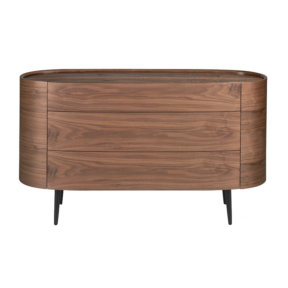 Cómoda de design moderno com uma estrutura de madeira folheada a nogueira natural e pernas originais em aço inoxidável preto. Dispõe de um amplo espaço de arrumação com 3 gavetas com sistema de fecho suave.