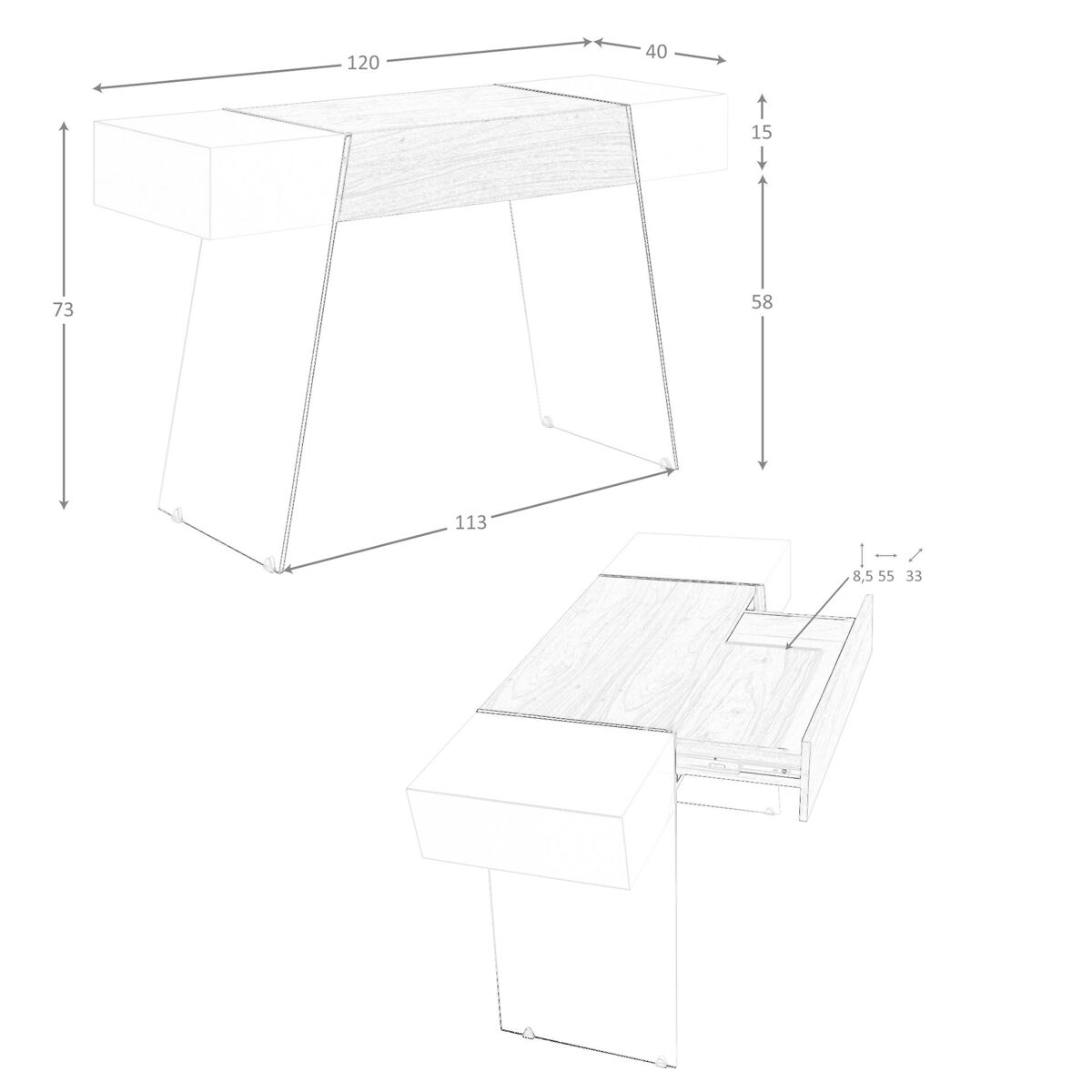 Mesa de consola retangular com um design moderno em madeira folheada a nogueira natural e um elegante tampo de madeira MDF cinzento. A sua estrutura com pés de vidro temperado dá um toque de modernidade e vanguarda que procura para a sua casa. Possui um grande espaço de arrumação com 1 gaveta com sistema de abertura e fecho extraível.