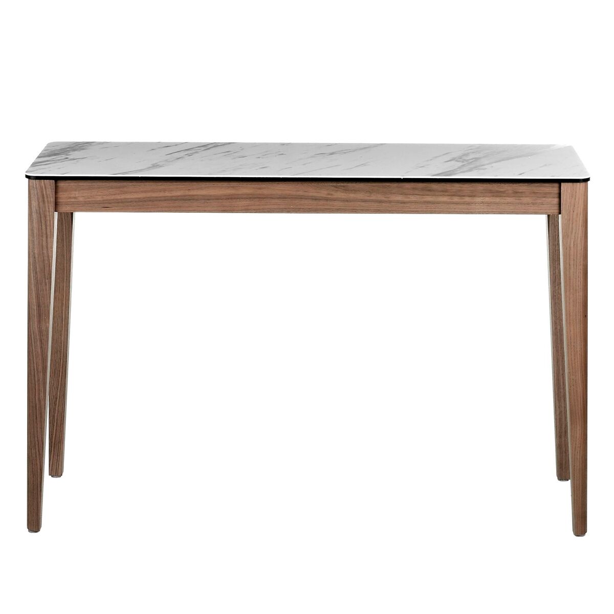 Mesa de consola retangular moderna com um tampo em mármore porcelânico branco com veios cinzentos num acabamento brilhante e pernas de madeira originais em folheado de nogueira natural. Uma peça com um design simples mas original que lhe dará um toque único e pessoal.