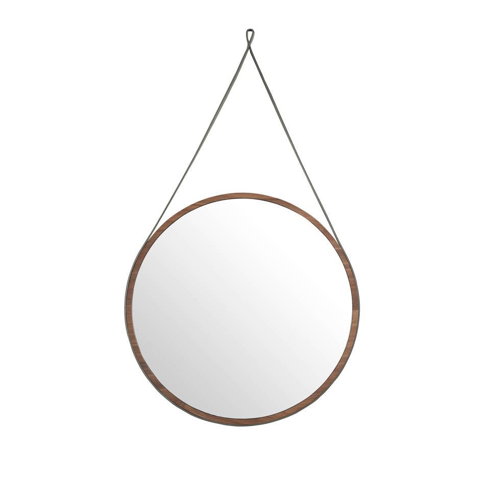 Espelho de parede redondo de design moderno com moldura de madeira folheada a nogueira natural. Este espelho é ideal para criar um ambiente elegante e vanguardista, proporcionando uma maior sensação de amplitude e luminosidade. Tem uma faixa original em pele de vaca castanha chocolate que dará um aspeto sofisticado ao seu quarto.