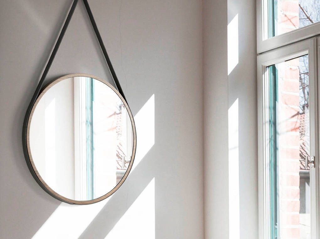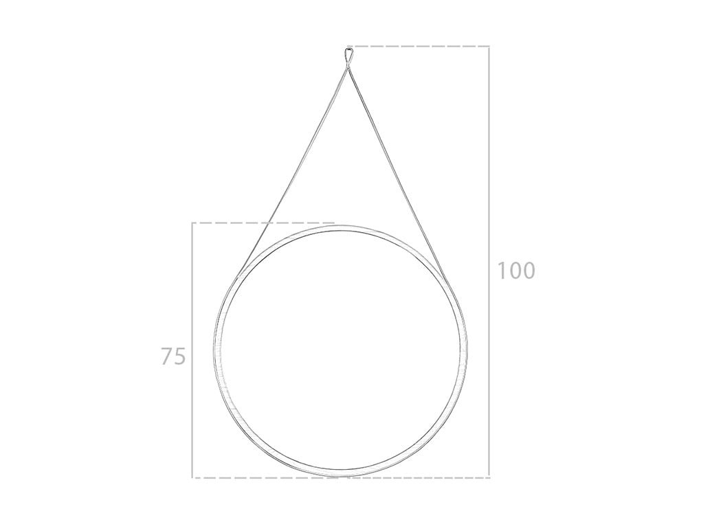- O seu cinto de couro fixo, bem como o seu acabamento linear, criam um contraste perfeito entre as linhas arredondadas do espelho.