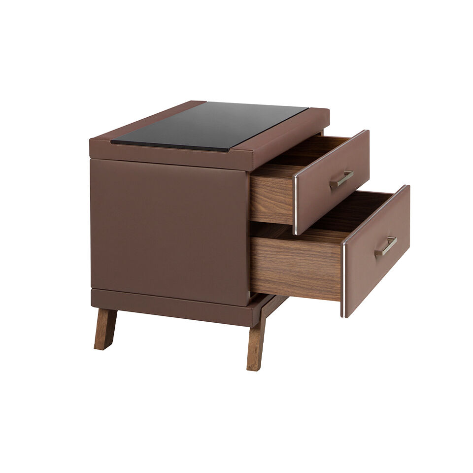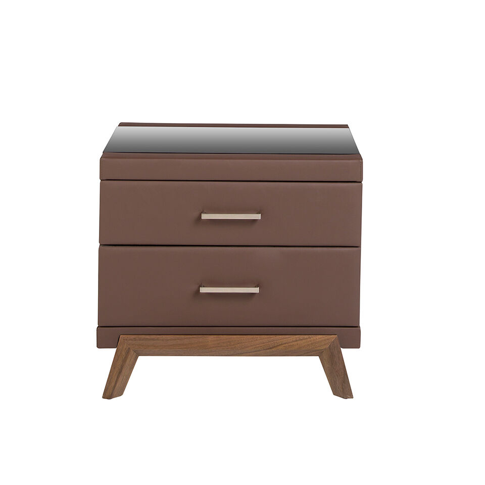 Mesa de cabeceira de design moderno com estrutura de madeira folheada a nogueira natural estofada em couro ecológico castanho chocolate e pernas de madeira originais folheadas a nogueira natural. Graças ao seu elegante tampo de vidro preto, obterá o aspeto sofisticado que procura para os seus quartos. Tem um amplo espaço de arrumação com 2 gavetas com um sistema de abertura por puxador e um sistema de fecho suave.