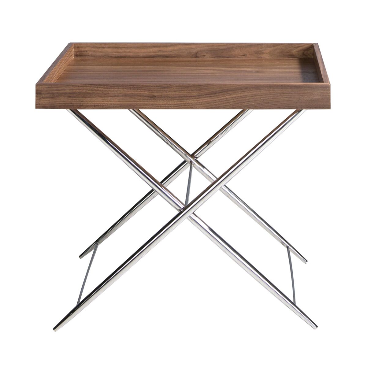Mesa de canto retangular de design moderno com tampo em madeira folheada a nogueira natural e pernas originais em aço inoxidável cromado. Uma peça com um design simples mas original que lhe dará um toque único e pessoal.