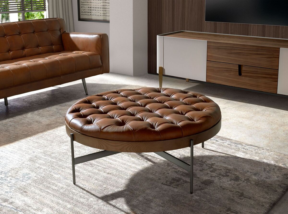 Mesa de centro redonda em pele castanha escura, nogueira e aço escuro modelo 2147 Angel Cerdá S.L.