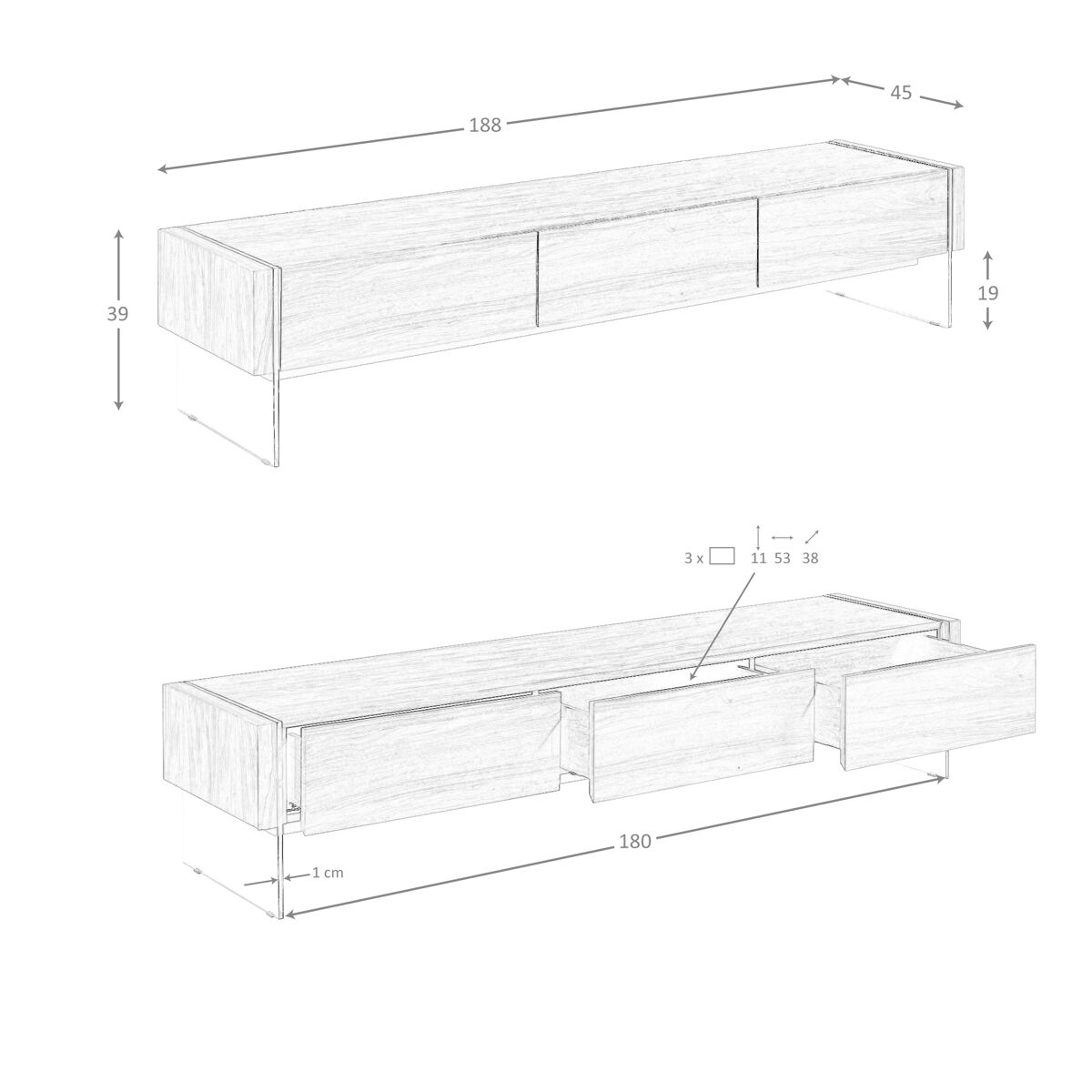 Suporte de TV de design moderno com estrutura em madeira folheada a nogueira natural e pernas originais em vidro temperado. Dispõe de um amplo espaço de arrumação com 3 gavetas com sistema de fecho suave e sistema de fecho suave.