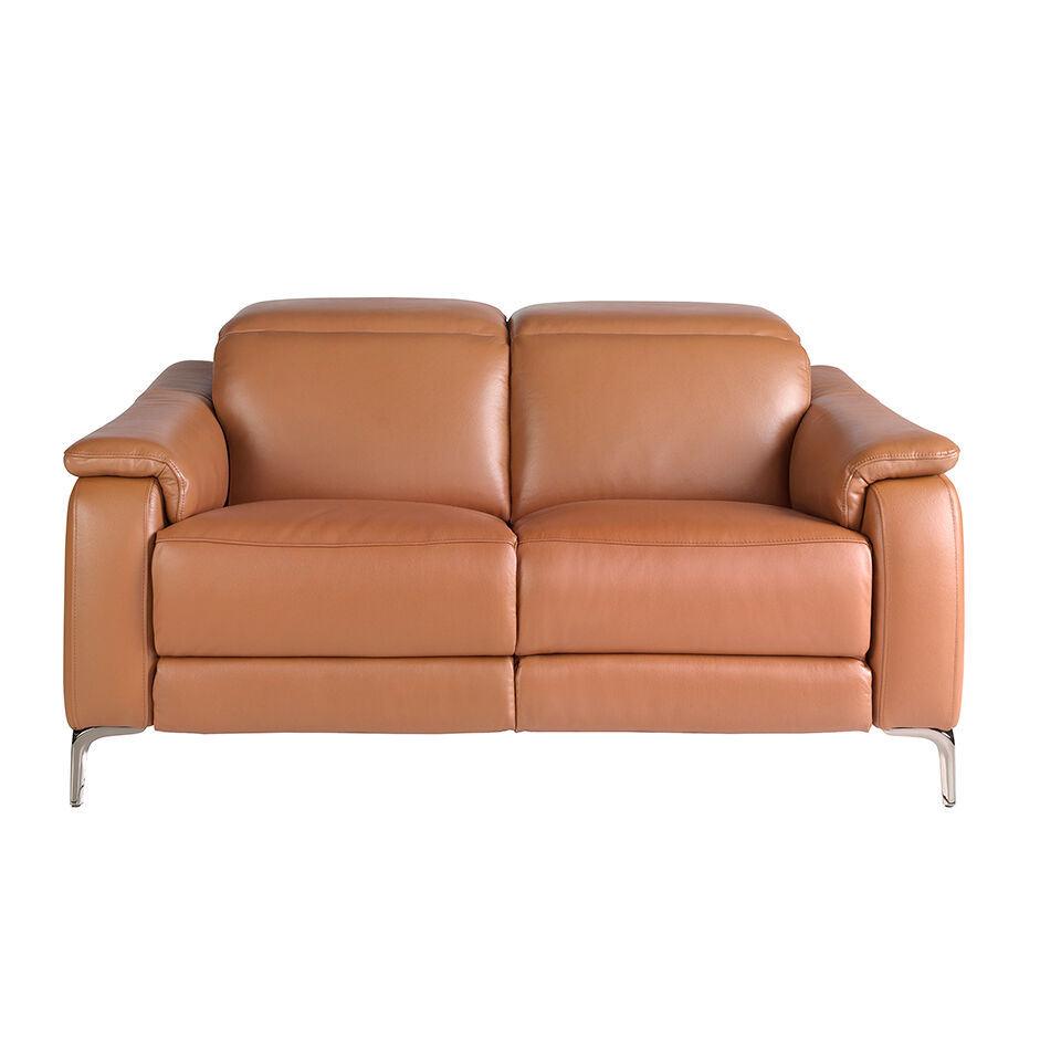 Sofá de relaxamento de 2 lugares de design moderno estofado em pele de vaca castanha com apoio de cabeça para maior conforto. Tanto pelo seu estilo como pelas suas pernas em aço inoxidável cromado escuro, este sofá dará o toque de vanguarda e elegância que procura na sua casa.Os seus 2 sistemas de relaxamento eléctricos proporcionam-lhe o conforto extra de que necessita para relaxar.
