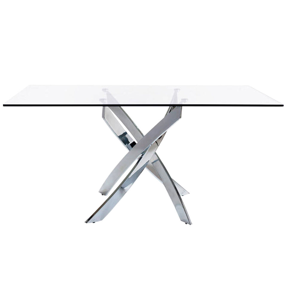 Mesa de jantar retangular moderna com tampo fixo em vidro temperado. As suas pernas originais em aço inoxidável cromado são elementos-chave a destacar no seu design.