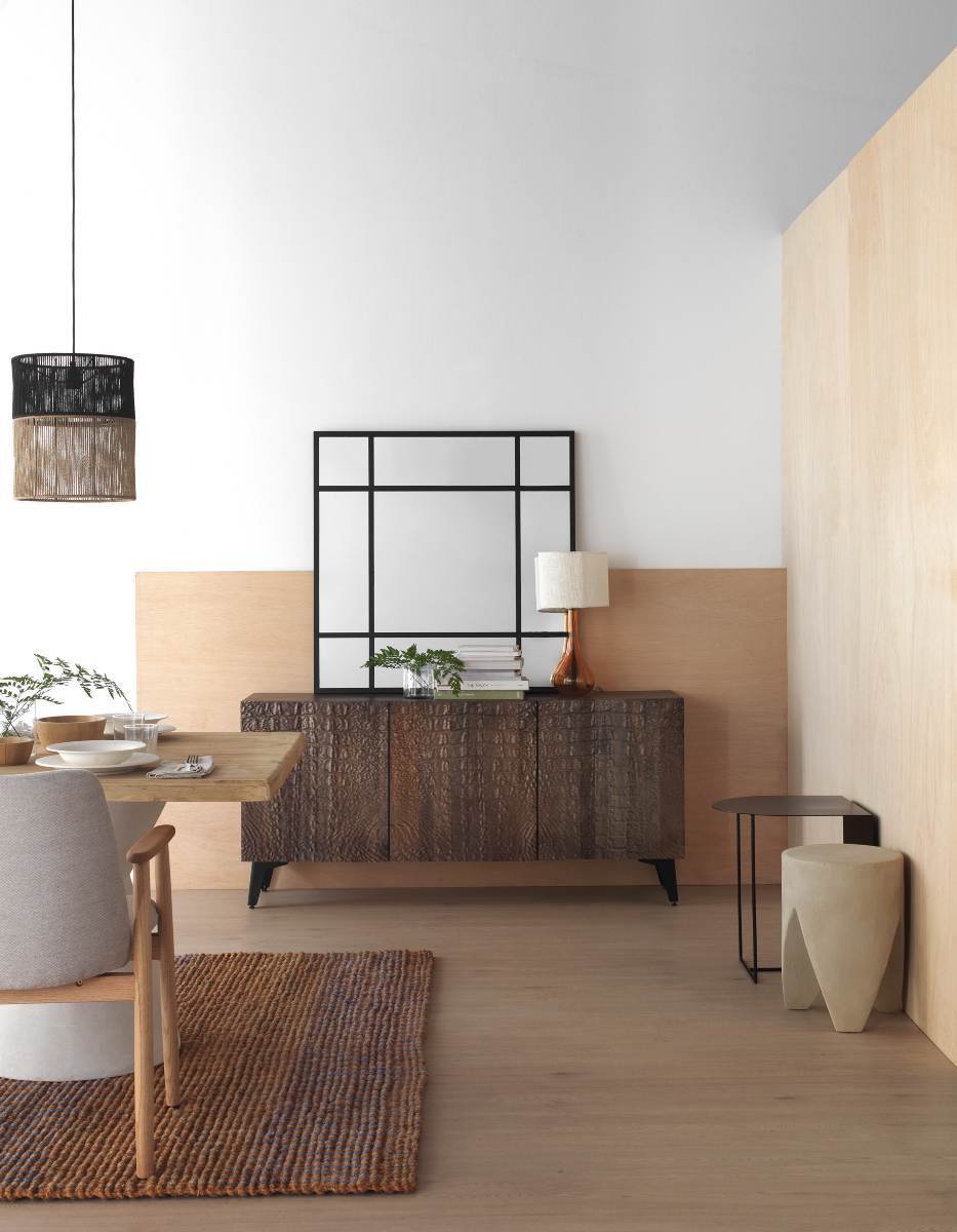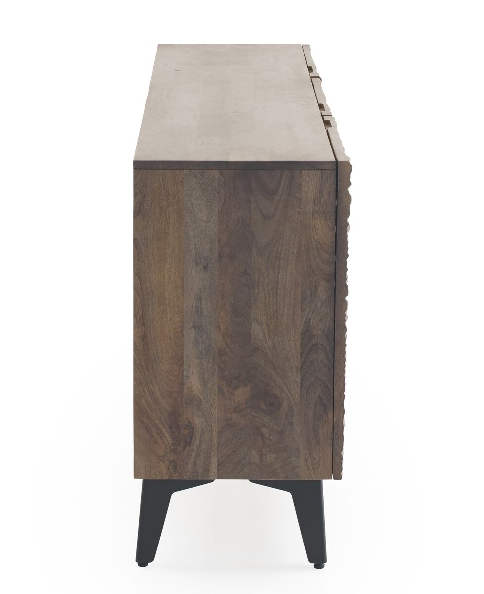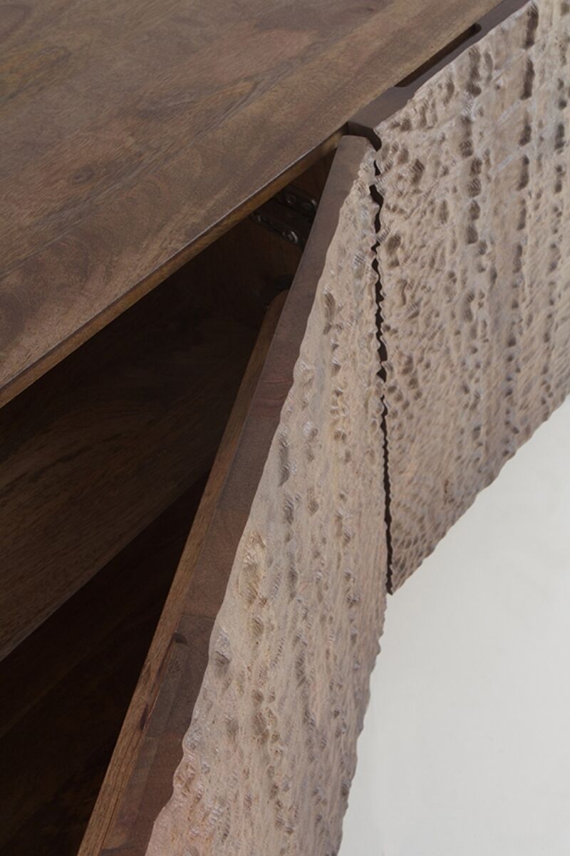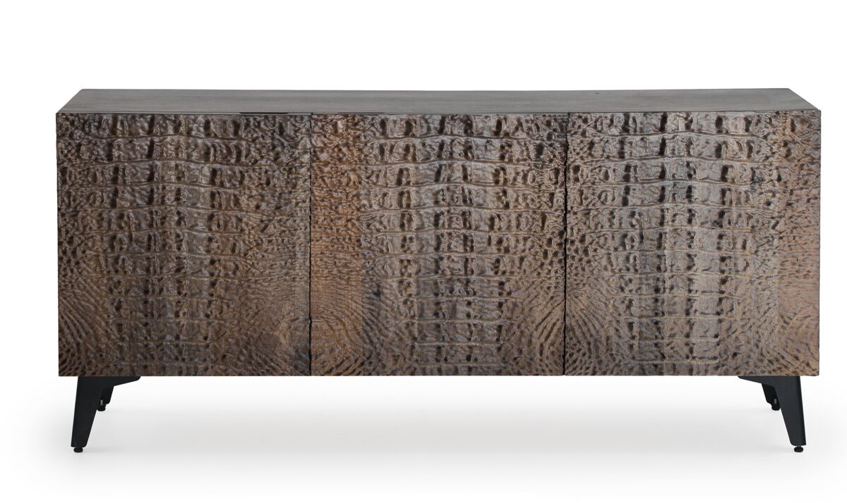 Aparador de 3 portas, concebido para transformar qualquer espaço. Com um acabamento em pele de crocodilo castanha que confere um toque de luxo e distinção, este aparador apresenta um bonito tampo em madeira de manga que combina estética e durabilidade. As suas pernas metálicas proporcionam um suporte robusto e moderno, criando um contraste perfeito que realça o seu design contemporâneo. Ideal para organizar e expor os seus objectos com estilo, este aparador é a peça central de que a sua casa precisa.