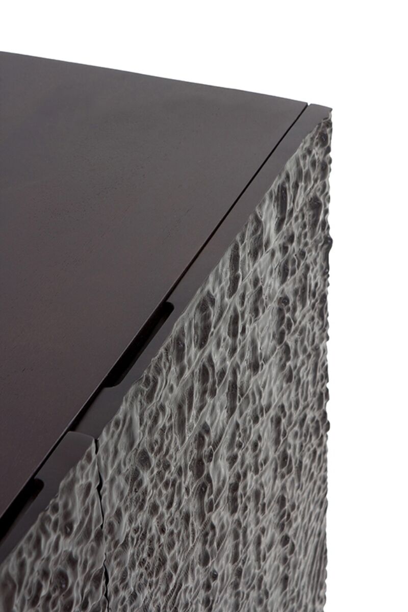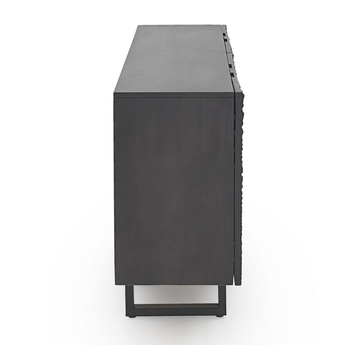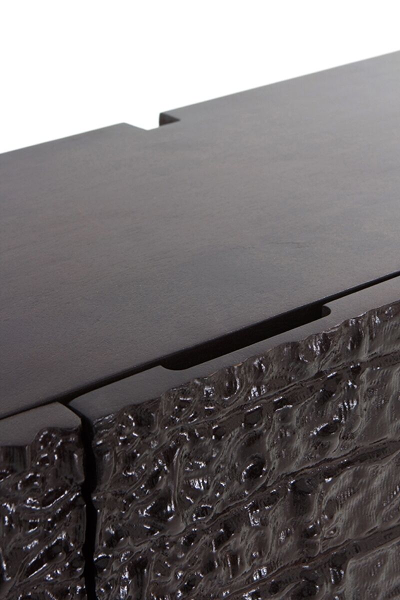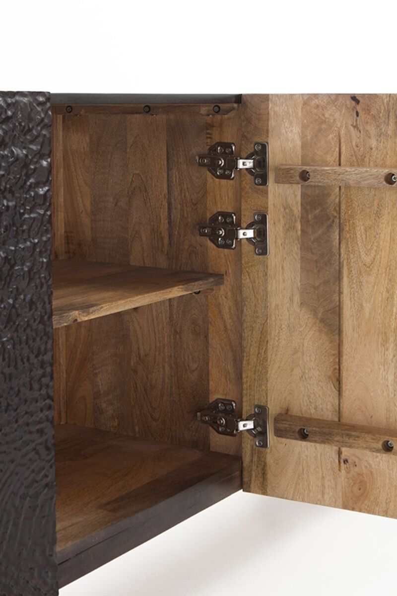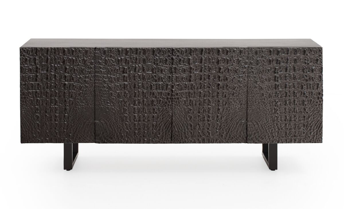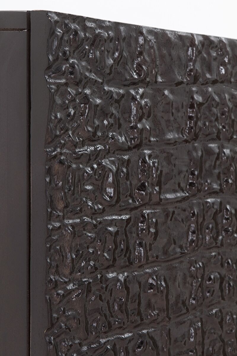 Aparador de 4 portas em requintado couro de crocodilo preto, uma peça única que combina o calor da madeira de manga com a modernidade das suas pernas metálicas em forma de U. Com o seu design retangular e o sofisticado acabamento brilhante na frente, torna-se o centro das atenções em qualquer espaço. A sua funcionalidade não fica atrás, pois no interior encontrará uma prateleira fixa a meia altura e dois compartimentos separados, ideais para organizar os seus objectos com estilo. As dobradiças de fecho suave garantem uma utilização silenciosa e confortável. Além disso, a altura das pernas de 18 cm proporciona um toque de leveza, enquanto a sua montagem fácil (apenas pernas) permite-lhe desfrutar desta joia decorativa num piscar de olhos.
