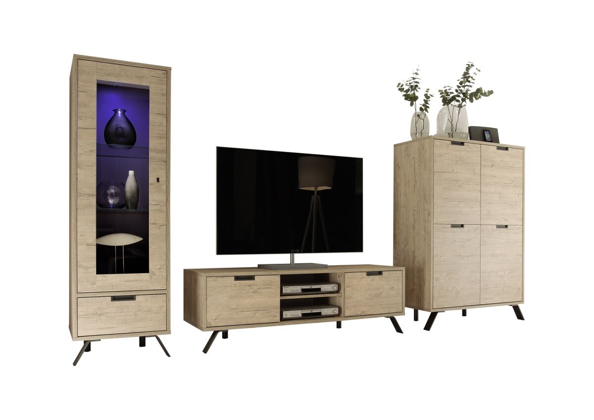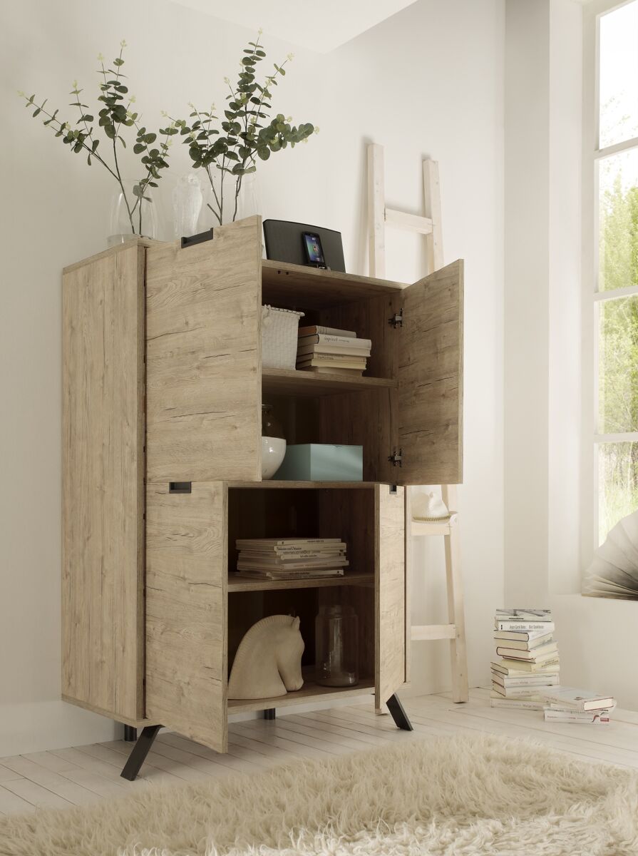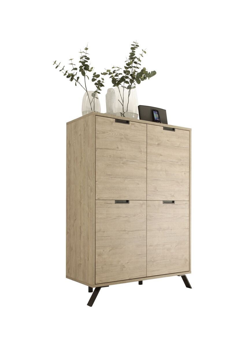 O aparador alto Palma possui 4 portas em estrutura de aglomerado de madeira de carvalho e pernas de ferro. Este aparador de design elegante e moderno oferece uma grande capacidade de arrumação, ideal para manter os seus objectos e acessórios organizados. Com 106 cm de largura x 148 cm de altura x 50 cm de profundidade, é perfeito para aproveitar ao máximo o espaço e acrescentar funcionalidade e estilo à sua casa. Ideal para salas de estar e salas de jantar