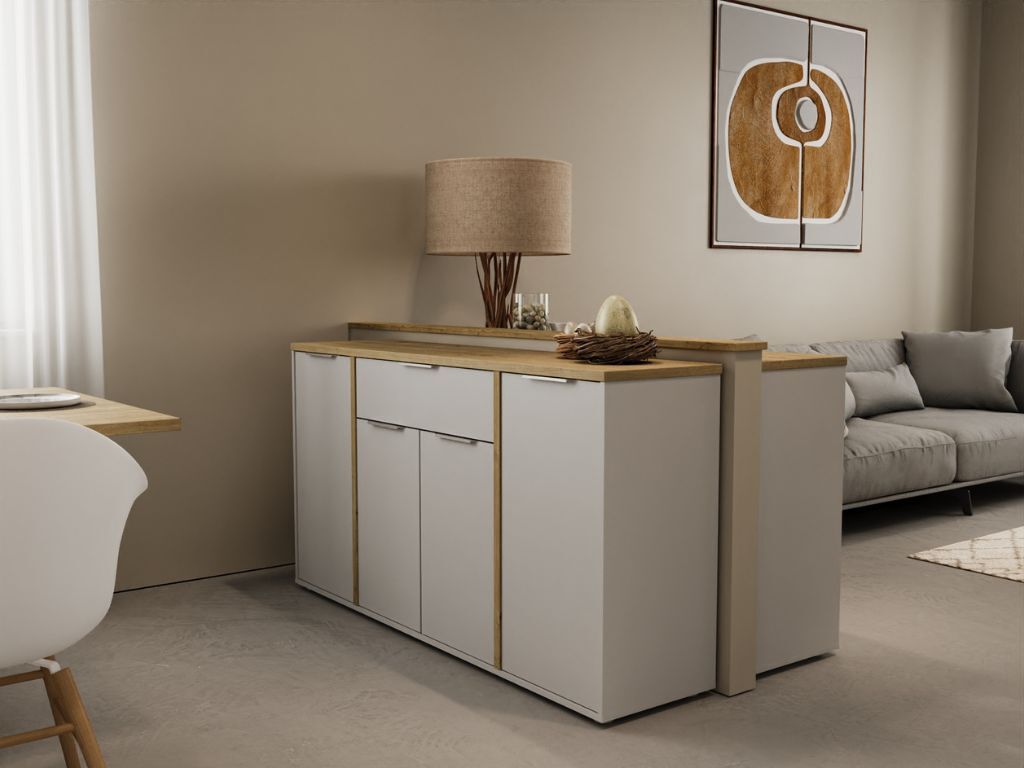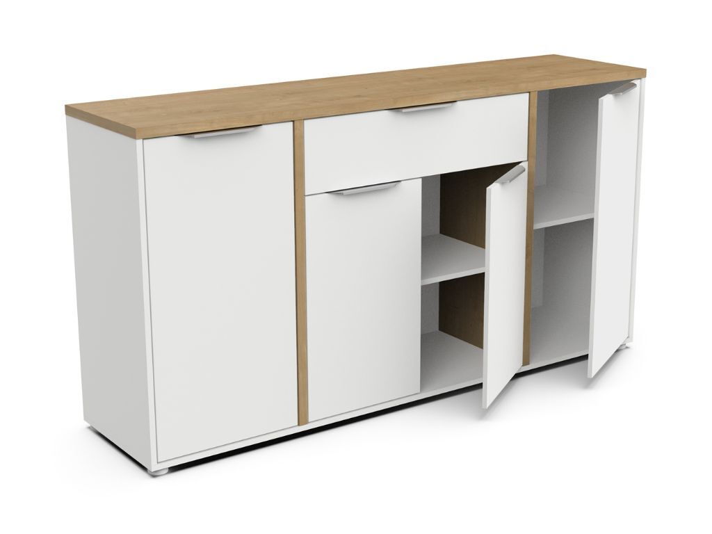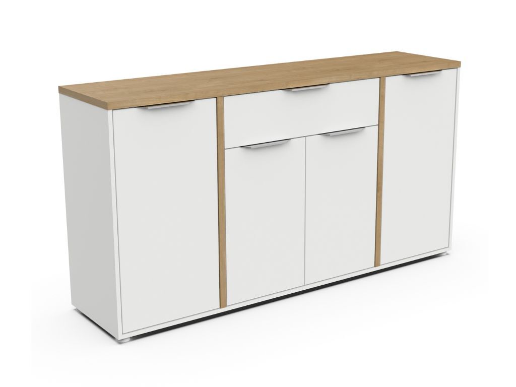 Aparador AMBIHOME ESSENCE, na cor branco/carvalho hamilton, C161xP40xA86cm, em melamina resistente. Puxadores de alumínio prateado. O aparador dispõe de 4 portas e 1 gaveta. Requer montagem.