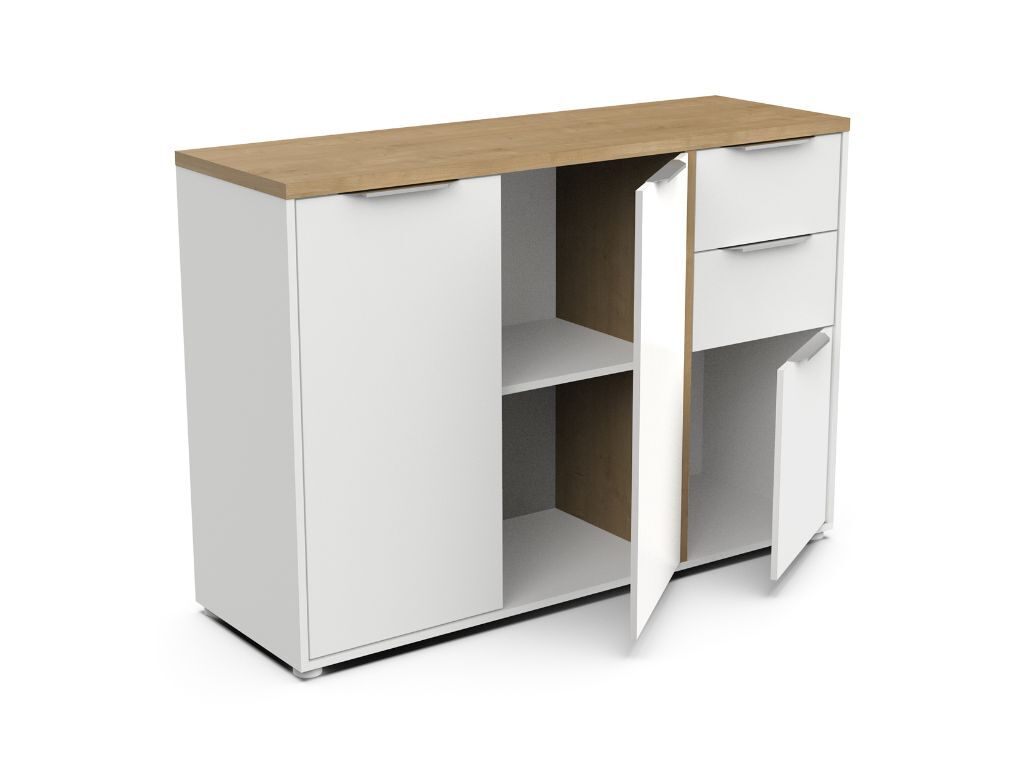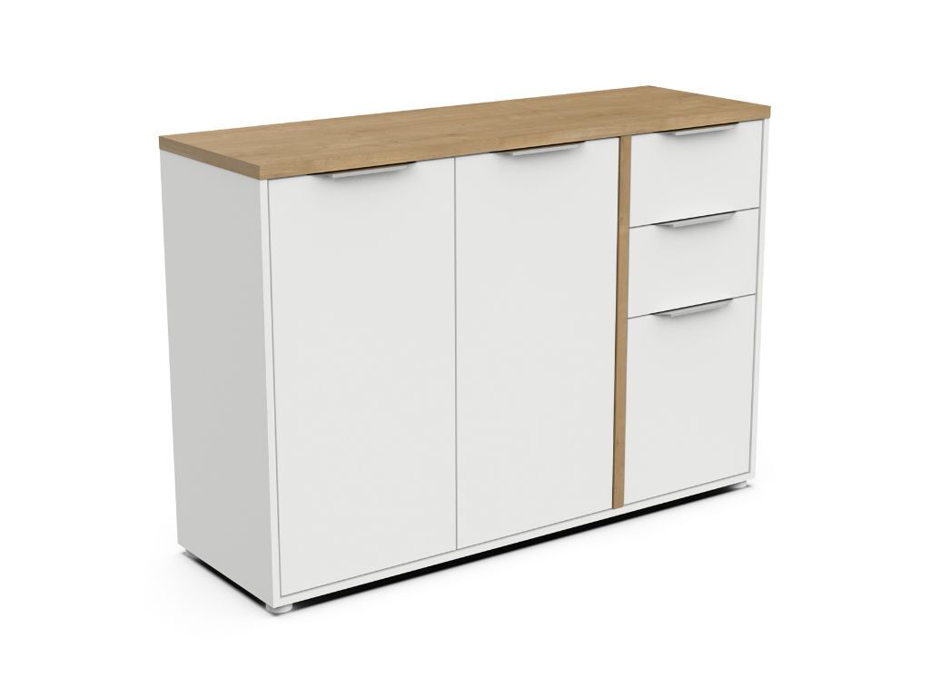 Aparador AMBIHOME ESSENCE, na cor branco/carvalho hamilton, C121xP40xA85cm, em melamina resistente. Puxadores de alumínio prateado. O aparador dispõe de 3 portas e 2 gavetas. Requer montagem.