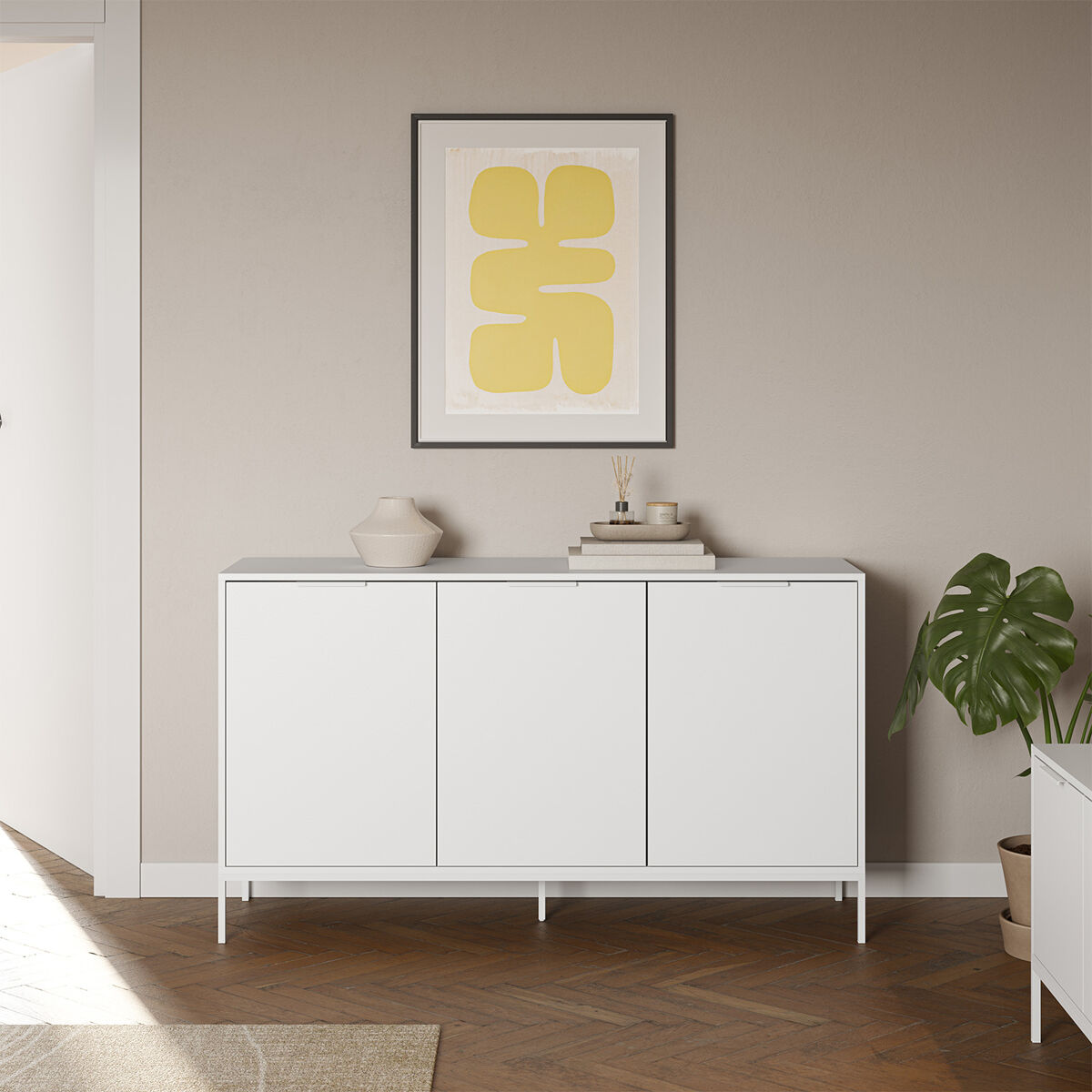 · O aparador Auri é composto por 3 portas, com capacidade de arrumação mais do que necessária para guardar todos os elementos que pretende ter na sala. É uma peça com um design elegante e charmoso que pode melhorar instantaneamente o ambiente decorativo de qualquer casa.