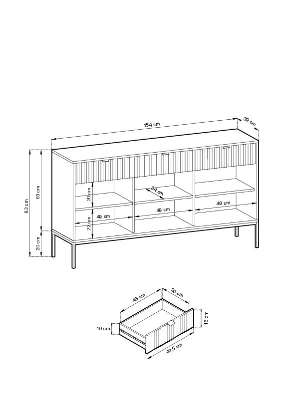 O armário NOVA SANDS apresenta uma opção de arrumação expansiva com o seu tamanho de 83x154x39 cm. A construção em madeira de engenharia, realçada com melamina e aço em preto, oferece seis prateleiras e três gavetas atrás de três portas com dobradiças. Concebido para a casa moderna, este armário combina o estilo retro com a funcionalidade, tornando-o um elemento versátil em qualquer decoração.