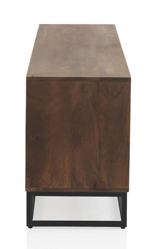 O aparador sob 2 portas é feito de madeira maciça de manga natural, com frente de portas laminadas em relevo vertical. Ele possui abertura sistema push e dobradiças de fecho suave. Atrás das portas, há uma prateleira a meia altura de 82 cm de largura. As medidas dos 3 vazios são 27 cm de largura e 42,5 cm de altura. A base é feita de metal preto e tem 13 cm de altura. A montagem é simples, sendo necessário apenas montar a base do pé.