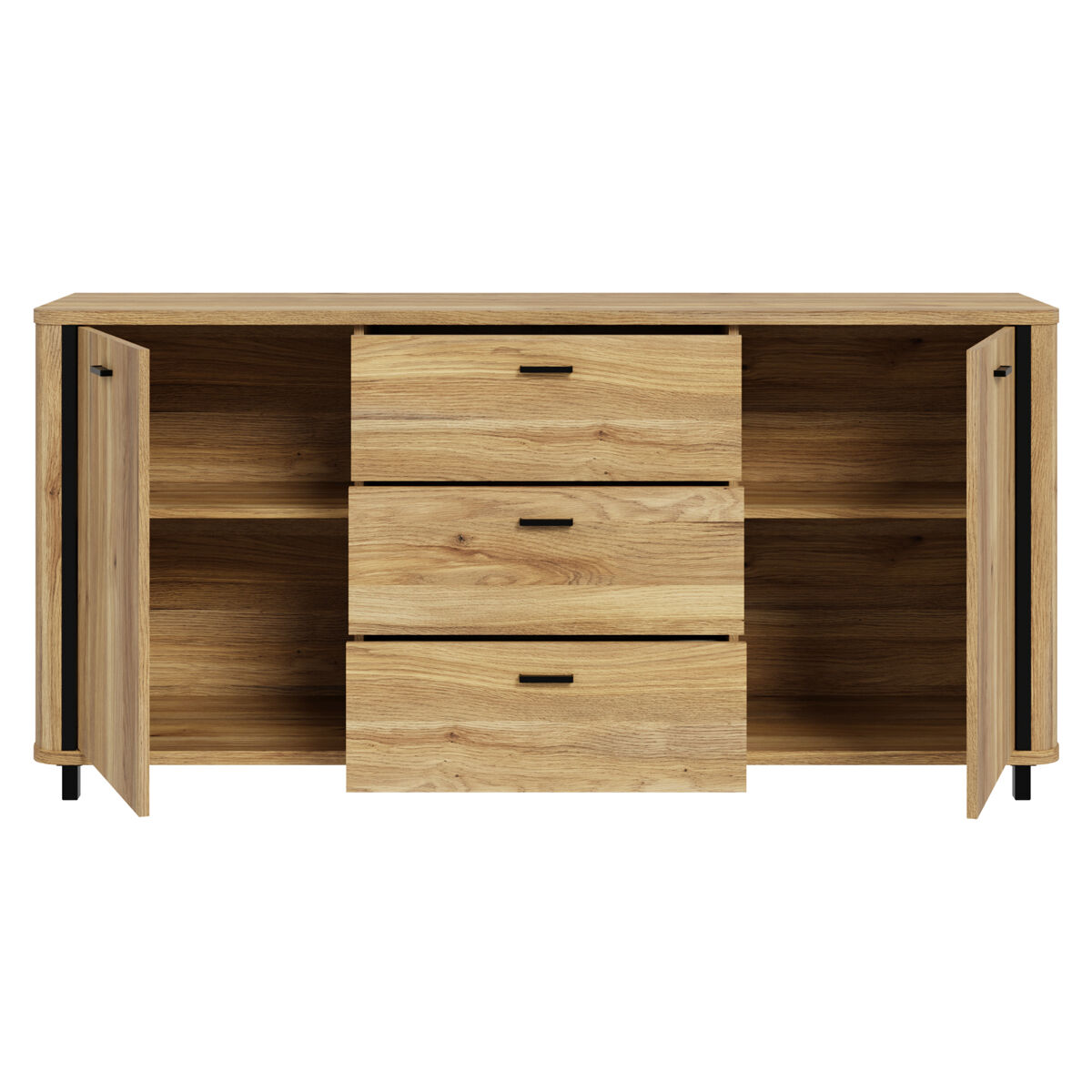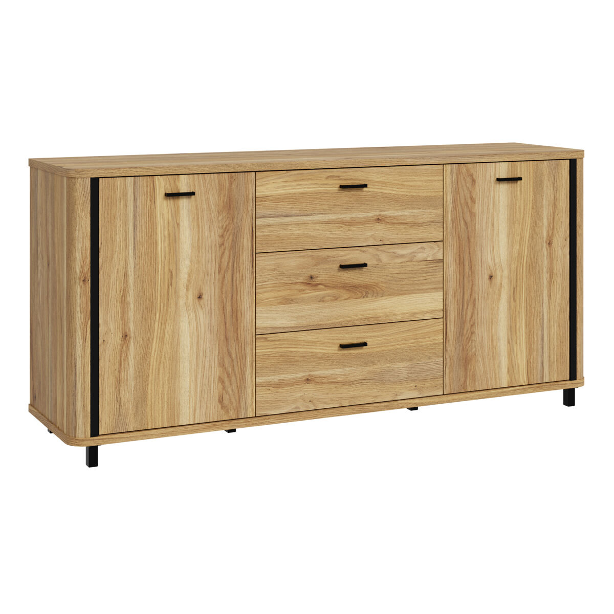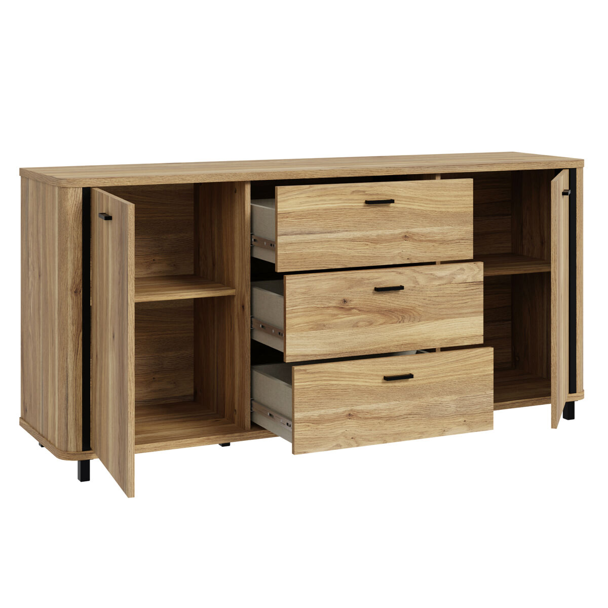 O aparador HARMONIA combina design moderno e funcionalidade, oferecendo 2 portas e 3 gavetas com sistema de fecho suave. As gavetas abrem completamente para facilitar o acesso. A estrutura, em painel de partículas cor carvalho, proporciona resistência e durabilidade, complementada por puxadores pretos foscos, que conferem um acabamento elegante e contemporâneo. Ideal para manter a sala de estar, sala de jantar ou hall de entrada bem-organizados, une estilo e utilidade na mesma peça de mobiliário.