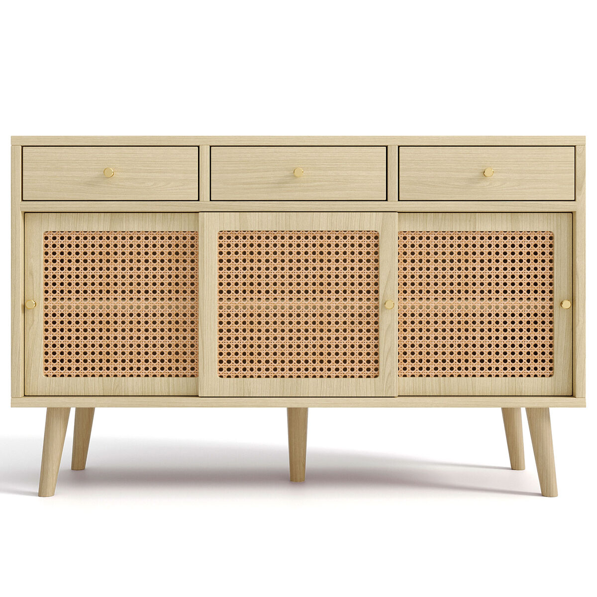 Esta cómoda oferece várias configurações para satisfazer as suas diversas necessidades. Três gavetas e três portas permitem organizar os seus pertences com facilidade e criar um espaço organizado. O móvel, com a sua base em rattan e puxadores em metal, combina na perfeição elementos naturais e industriais. O acabamento em carvalho acrescenta ainda mais aconchego à sua casa.