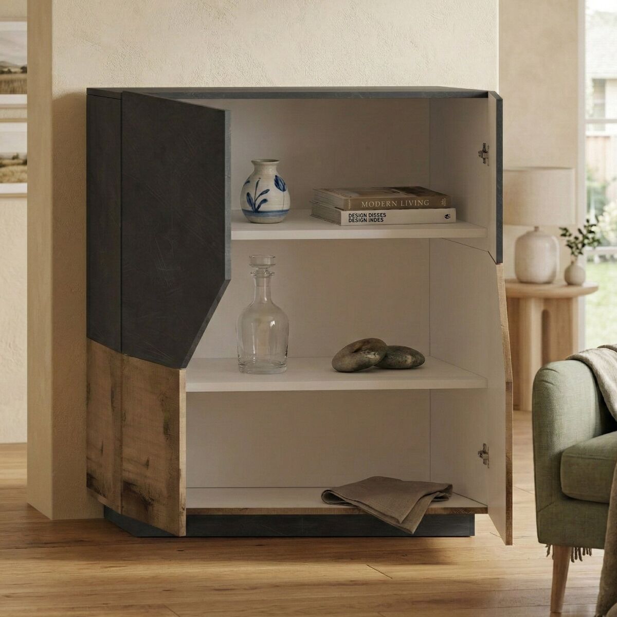 ESTRUTURA E UTILIZAÇÃO - Aparador de sala prático e económico, estruturado com duas portas de batente com efeito geométrico, estruturado no interior com prateleiras confortáveis - As portas são sem puxadores e equipadas com dobradiças maciças e guias metálicas, a abertura é feita por sistema push-pull - A estrutura é inteiramente na cor ardósia e bordo - A prateleira superior é perfeita para guardar sua televisão ou suas bugigangas favoritas.