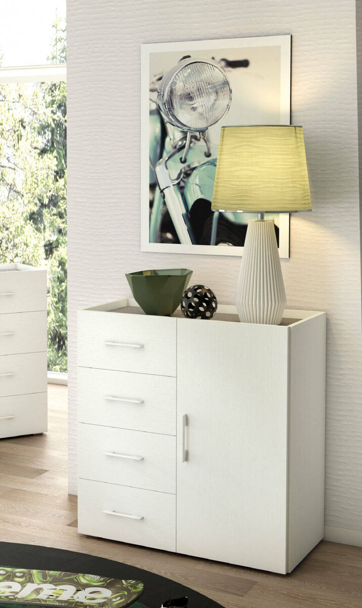 BUFFET DNAG - Móvel buffet com 1 porta e 4 gavetas, Aparador de sala, Armário multiuso com prateleiras, 100% Fabricado na Itália, Cm 90x41h87, Branco.