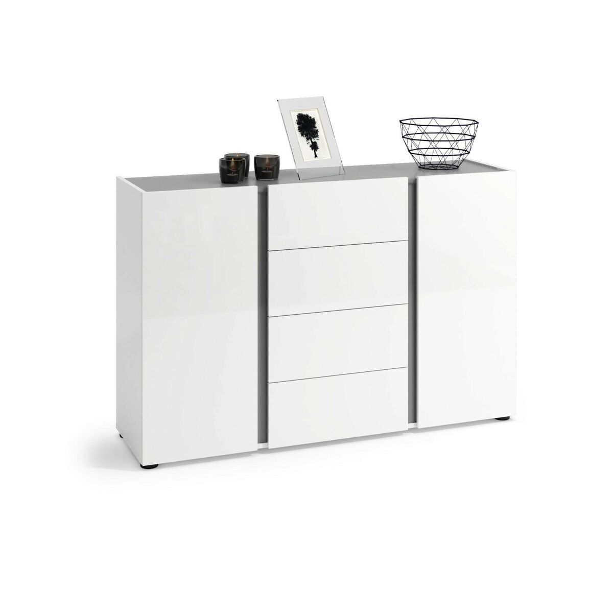 CARACTERÍSTICAS TÉCNICAS - Acessório de decoração versátil, projetado para fácil integração com outros móveis - Embalagem resistente, projetada para comércio eletrônico - Material: painel melamínico 16mm, Polipropileno - Informações adicionais: Desmontado - Certificado FSC - Produto composto por painel de aglomerado melamínico com espessura de 16 mm, material resistente a impactos e riscos, duradouro e impermeável - Com duas portas de batente com fecho suave, quatro prateleiras internas - Fornecido com quatro gavetas de arrumação - Equipado com pés em polipropileno cor antracite - Dobradiças em metal.