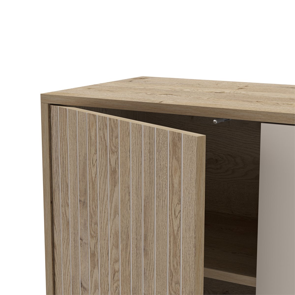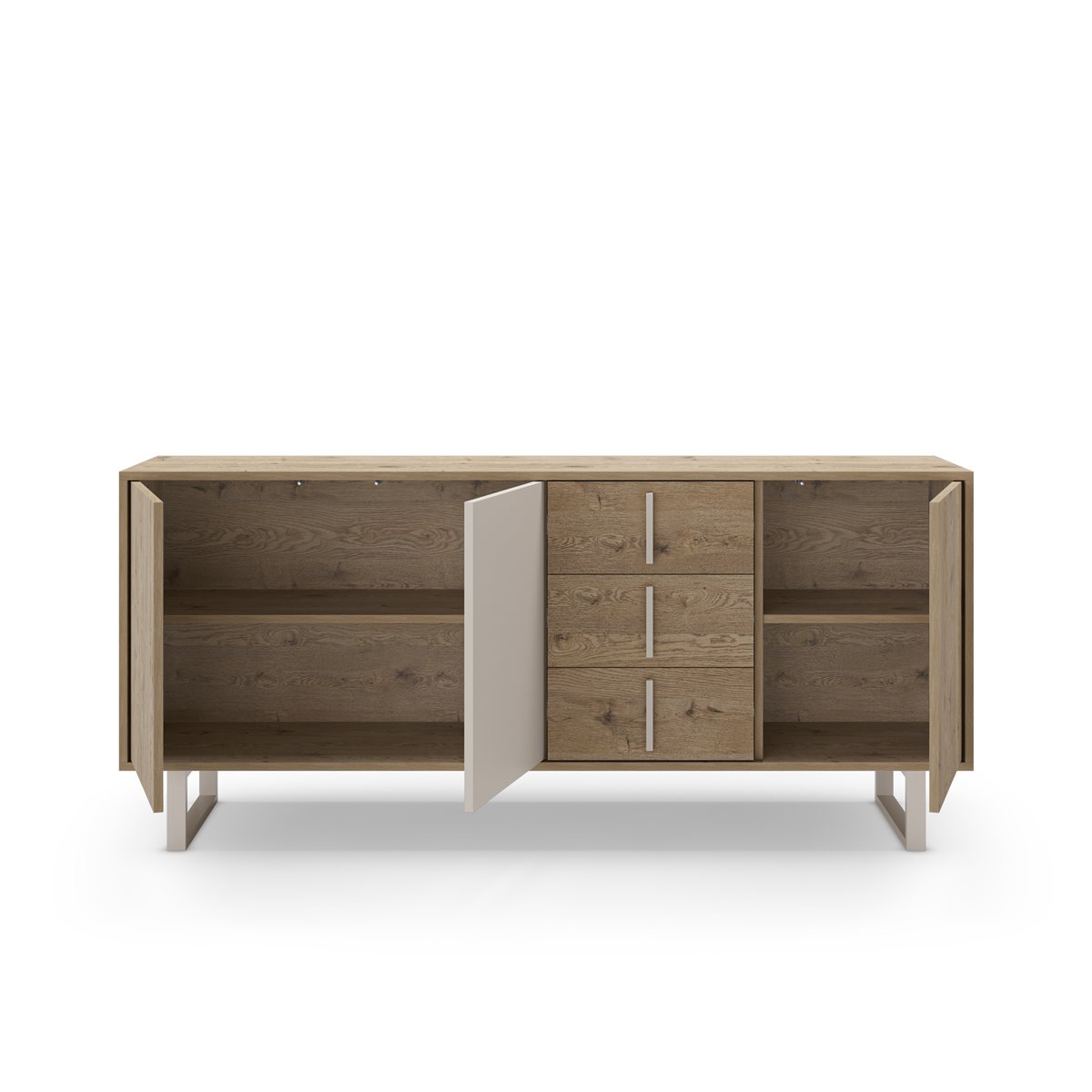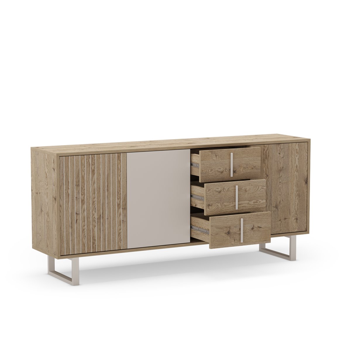 O aparador YAMIL combina design e funcionalidade numa estrutura em melamina, cores carvalho e vison, e a sua presença transmite elegância a qualquer tipo de ambiente. Possui 3 portas com prateleiras internas e um sistema de fecho suave, por botão, sem puxadores visíveis, além de 3 gavetas com puxadores para facilitar a utilização. Os pés em metal, na cor creme, complementam todo o conjunto, oferecendo estabilidade e um toque moderno. Com 180 cm de largura, 80 cm de altura e 40 cm de profundidade, é ideal para manter os seus artigos organizados com muito estilo.