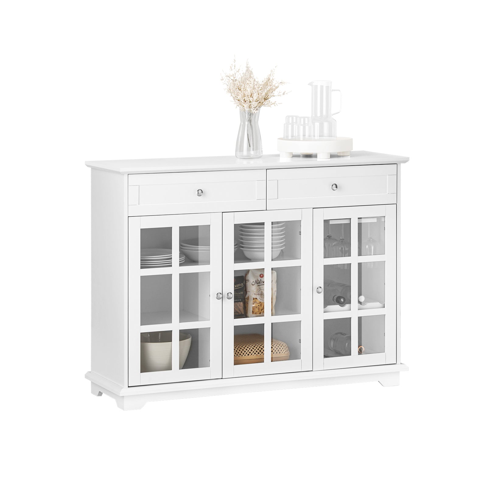Fabricado em MDF e vidro, este aparador de cozinha é robusto, estável e ideal para uma utilização prolongada.