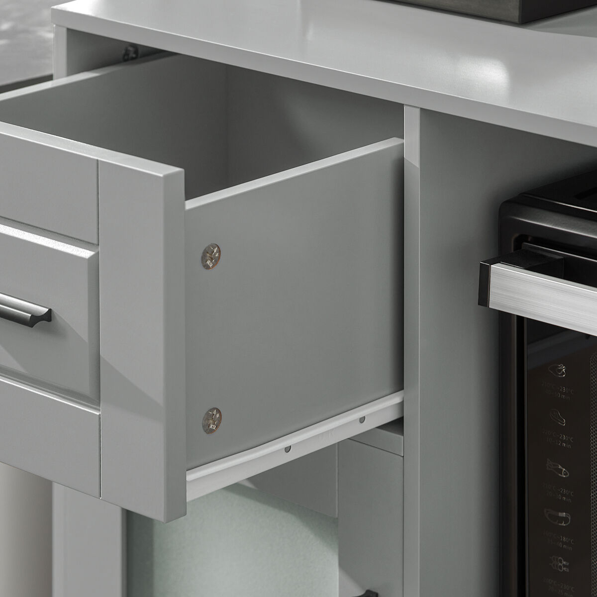 Armário de micro-ondas: Opta-se por organizar o microondas e o forno de cozinha. O grande compartimento aberto tamanho 56 x 37 x 39 cm com 1 orifício circular para passar através do cabo de alimentação do forno. E a prateleira atrás da porta é ideal para fornos de microondas.< p>