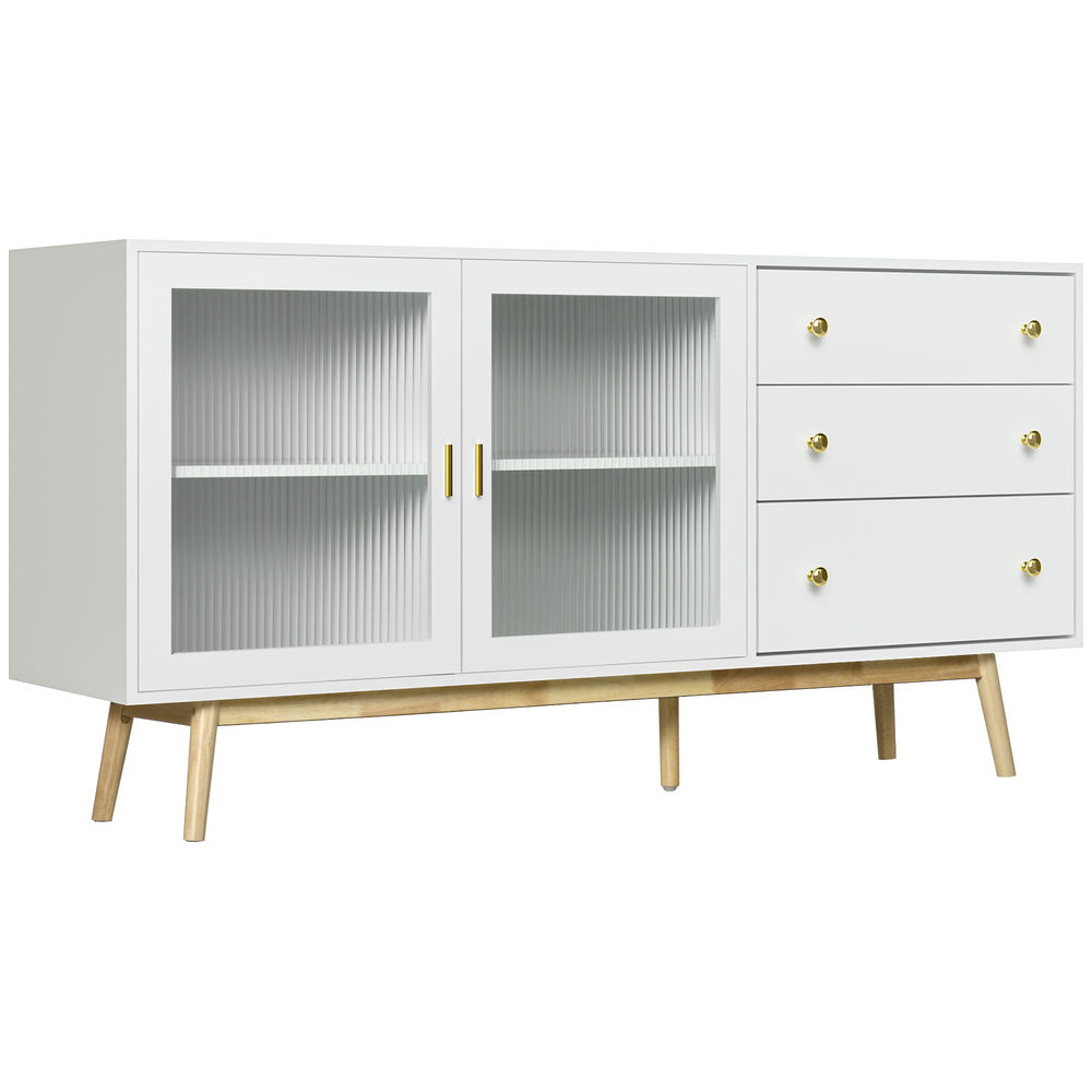 Este aparador de moderno da HOMCOM é o móvel perfeito tanto se está a precisar de um móvel auxiliar para a cozinha, um aparador ou um buffet para a sala de estar. Com grande capacidade de armazenamento, possui uma ampla bancada, armários fechados com prateleiras interiores e 3 gavetas. Fabricado em MDF é um móvel resistente e ideal para uma utilização prolongada. Além disso, possui um sistema anti-tombo para maior estabilidade e segurança! Características: - Aparador com dois tons de branco e madeira natural acrescentará estilo e elegância em sua casa - Conta com uma ampla bancada, armário e 3 gavetas - Os puxadores além de acrescentarem um toque de elegância facilita a abertura e fechamento das portas - Fabricado em MDF e pés de madeira de borracha resistentes e ideais para uma utilização prolongada - Possui um sistema anti-tombo para maior estabilidade e segurança - Ideal para sala de jantar, cozinha, sala de estar ou outros locais que necessite espaço extra de armazenamento - A base elevada facilita a limpeza e protege os seus objetos da humidade - A superfície pintada é resistente aos respingos de água e fácil de limpar com um pano húmido - Requer montagem Especificaciones: - Cor: Branco e madeira - Material: MDF, vidro e madeira de borracha - Medidas totais: 160x40x80 cm - Medidas do interior da gaveta: 54,5x29x10 cm (cada) - Medidas interna do armário: 47x36,5x28 cm (cada prateleira) - Altura em relação ao piso: 20 cm - Capacidade máxima de peso: 60 kg (total), 30 kg(bancada), 10 kg (prateleira) e 5 kg(gaveta) - Referência: 839-672V00WT O pacote inclui: - ● 1x Aparador; ● 1x Manual de instruções